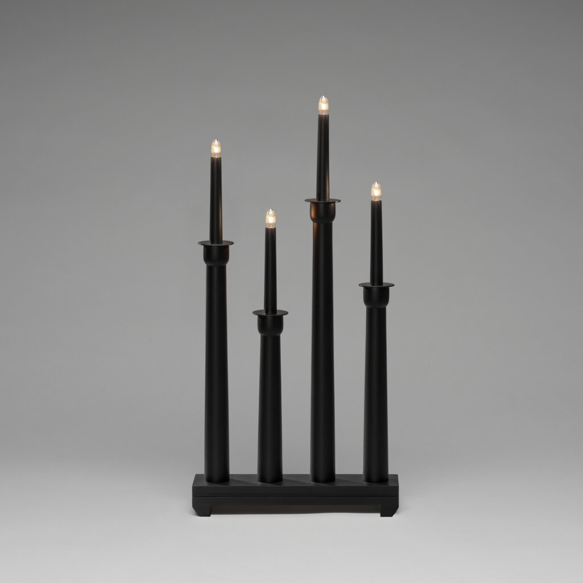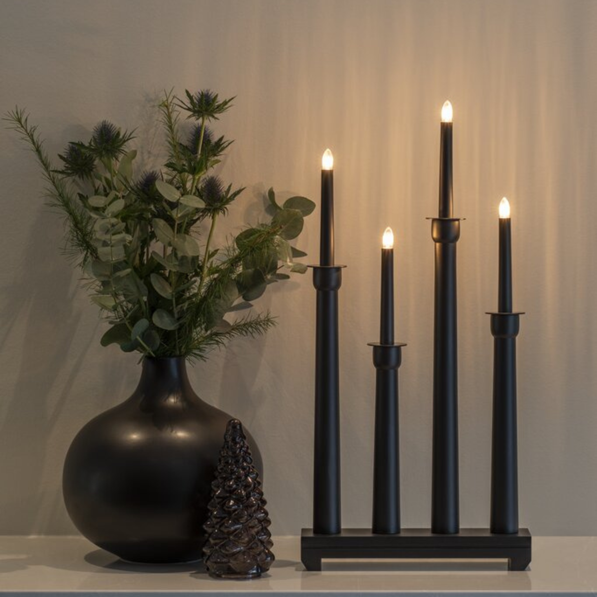 Adventstake 4 armet i sortlakkert tre. Sorte dekorasjons ringer.