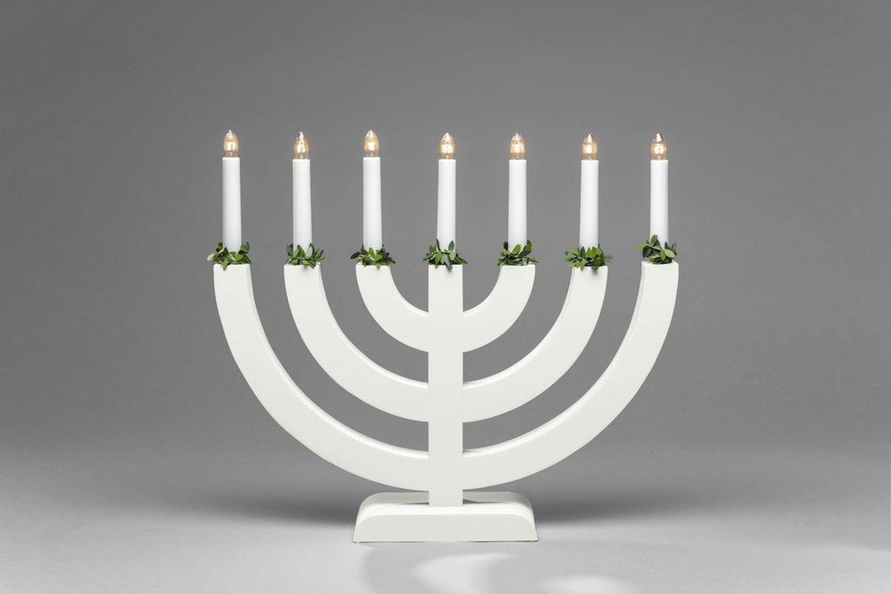 Hvit adventsstake med 5 armer og grønne mansjetter.