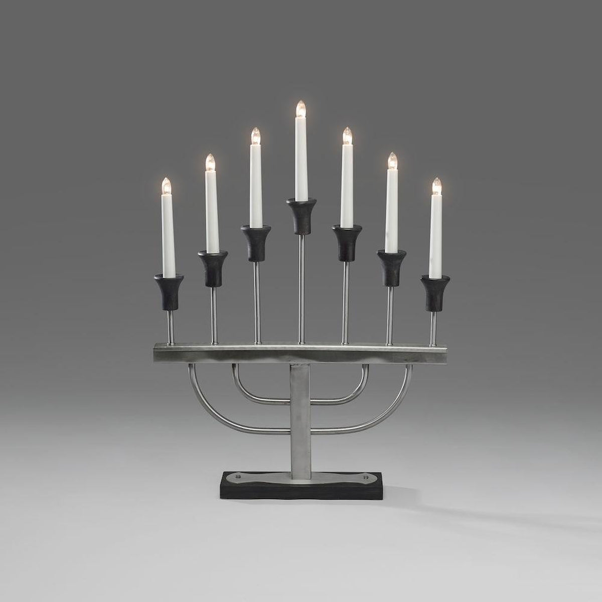 Stor adventsstake i ubehandlet metall. Rå aluminium kombinert med svart gir den et ekstra tøft uttrykk. Adventsstaken har slank fot, så selv om den er stor kan den fin plasseres i slank vinduskarm.