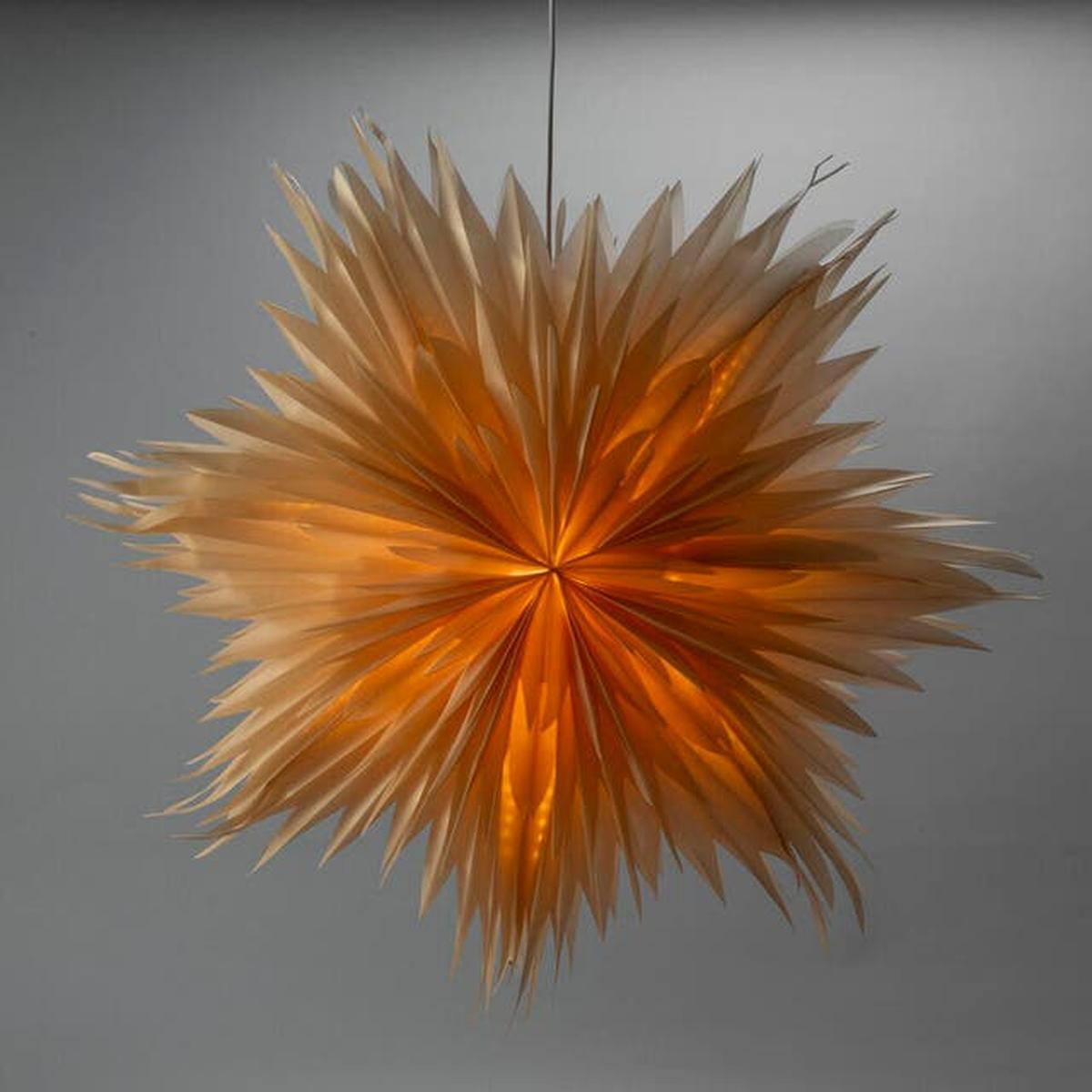 Imponerende adventsstjerne i gyllent papir med elegant perlemoreffekt. Med praktisk snorhenger og hvit snor med bryter – en tidløs klassiker som skaper en varm, koselig og hjemmekoselig julestemning.