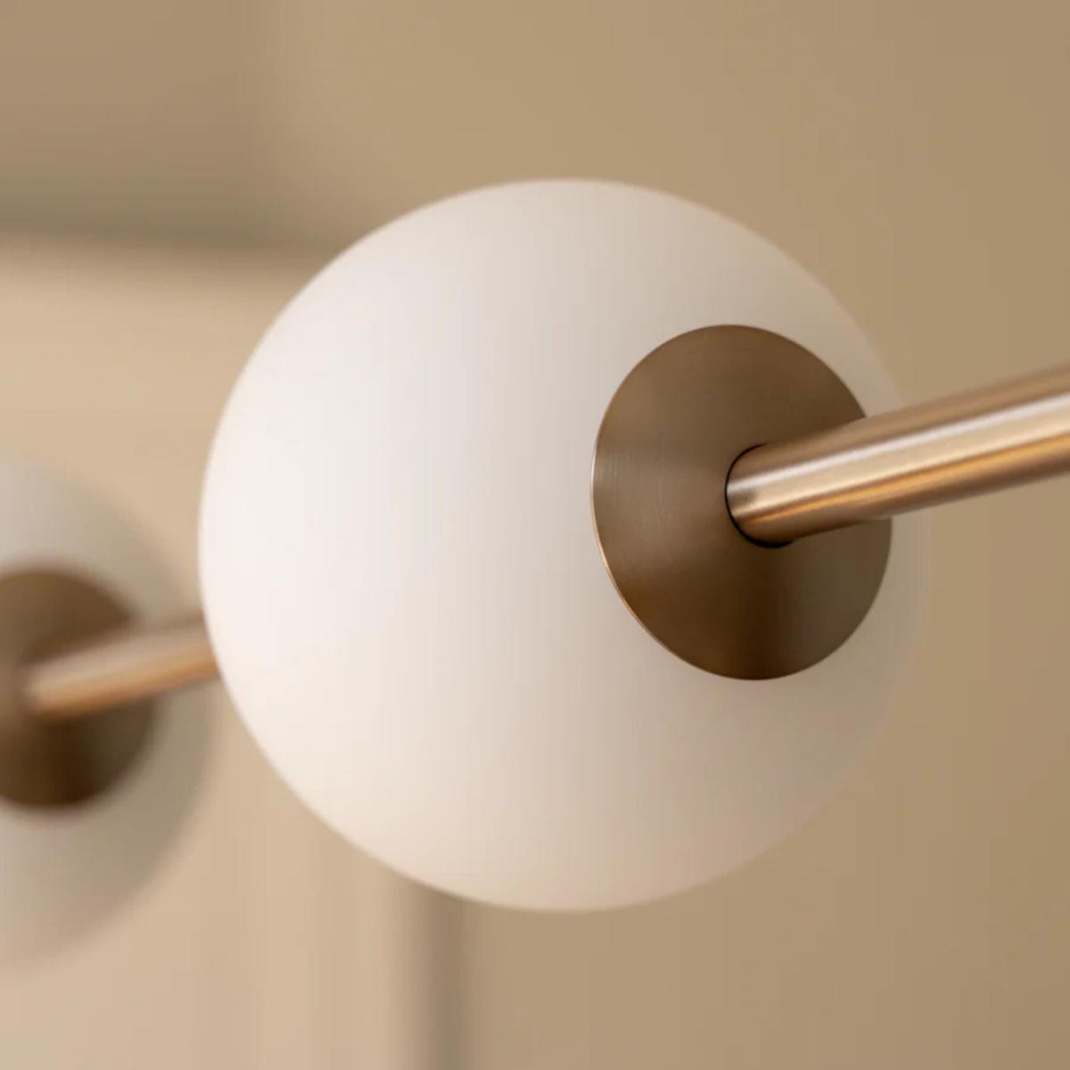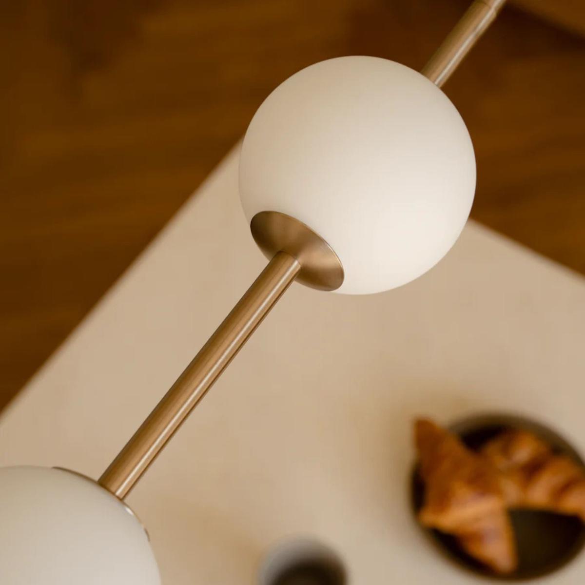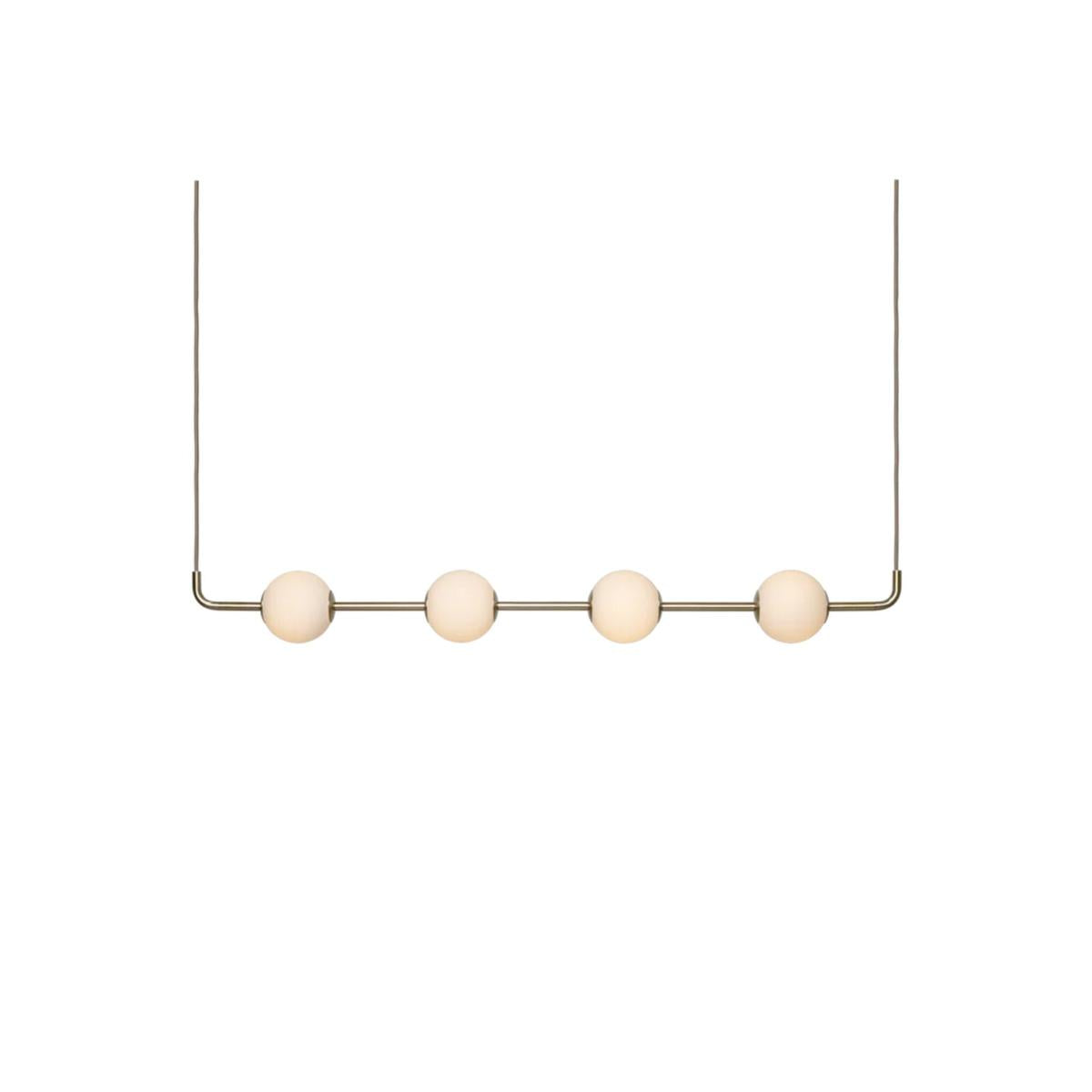 En skulpturell pendellampe med lysende glober som henger som perler på en kjede – Audrey Linear forener myke kurver, munnblåst opalglass og elegante metalldetaljer. De fire jevnt plasserte globene sprer et varmt og innbydende lys over spisebord, kjøkkenøyer og arbeidsområder, mens ledningene integreres diskret i designet slik at lampens silhuett settes i fokus.