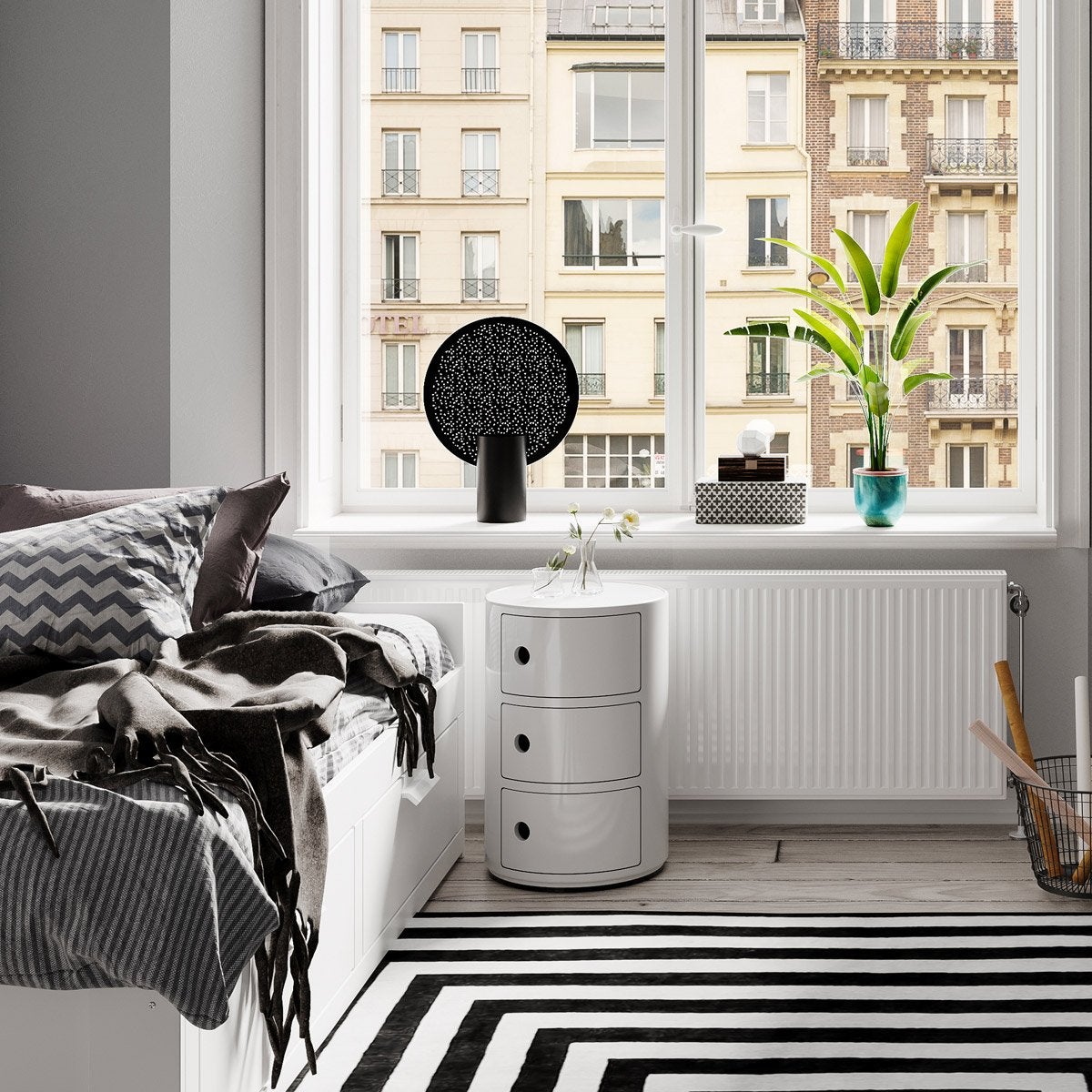 Colby bordlampe er det nyeste tilskuddet i den populære Colby-familien. Lampen har en enkel sylinderformet fot i metall og en praktfull skive som en aura på toppen. Skiven har dessuten et vakkert mønsterbilde som gir lampen det lille ekstra. Det som er ekstra finurlig med Colby-bordlampe er at den kan rettes i to forskjellige retninger og at den da oppleves som to helt forskjellige lamper – med skiven foran eller bak! Av denne grunn har vi valgt å plassere ledningen til siden for lampen, for at du selv skal kunne velge hvilken retning du vil at lampen skal være rettet i. Dette gjør også at lampen alltid kommer til å være stilig utenfra hvis du velger å sette den i et vindu.