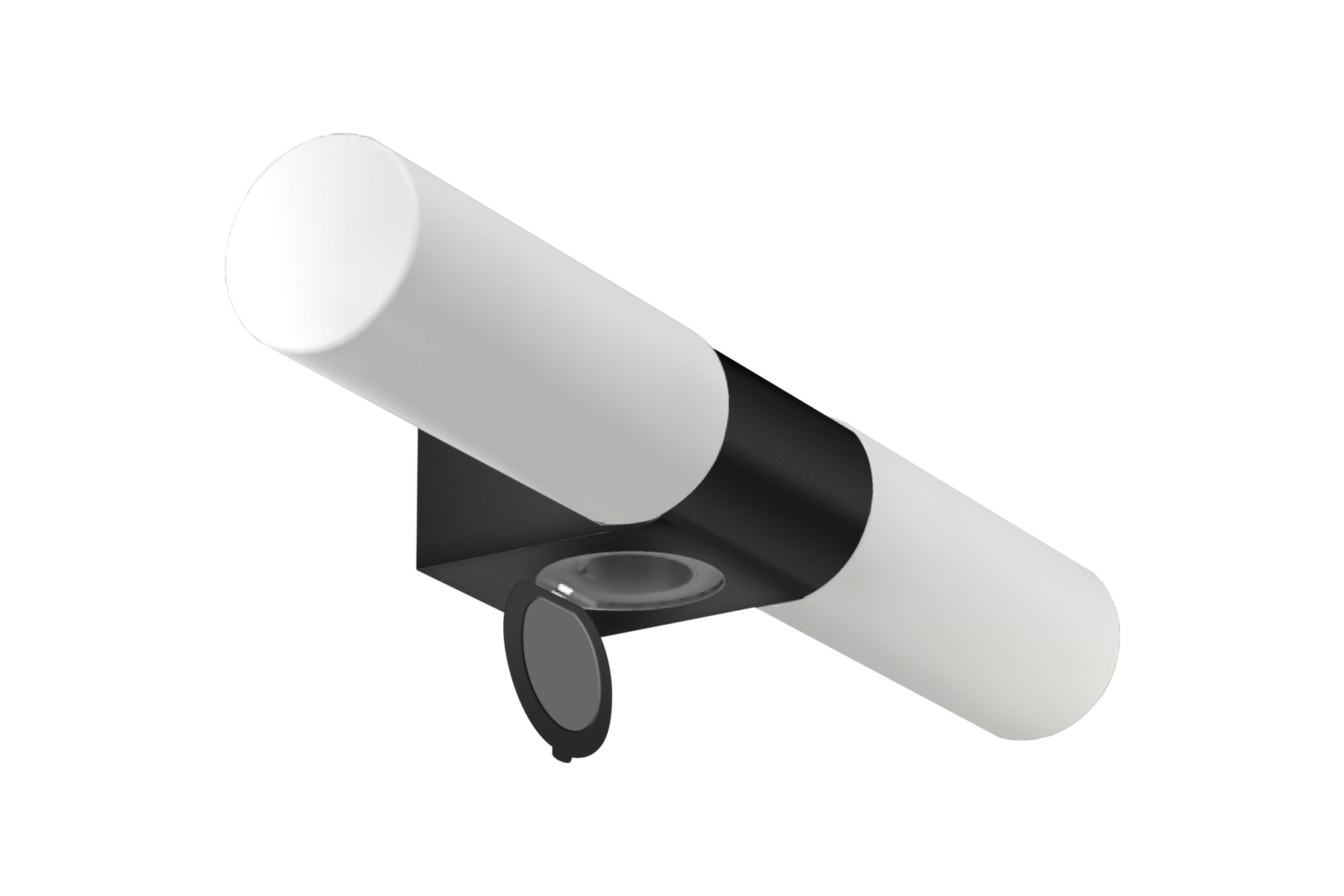 Lekker og praktisk vegglampe til baderom, i svart og opalhvit, med uttak til stikkontakt på selve lampen.