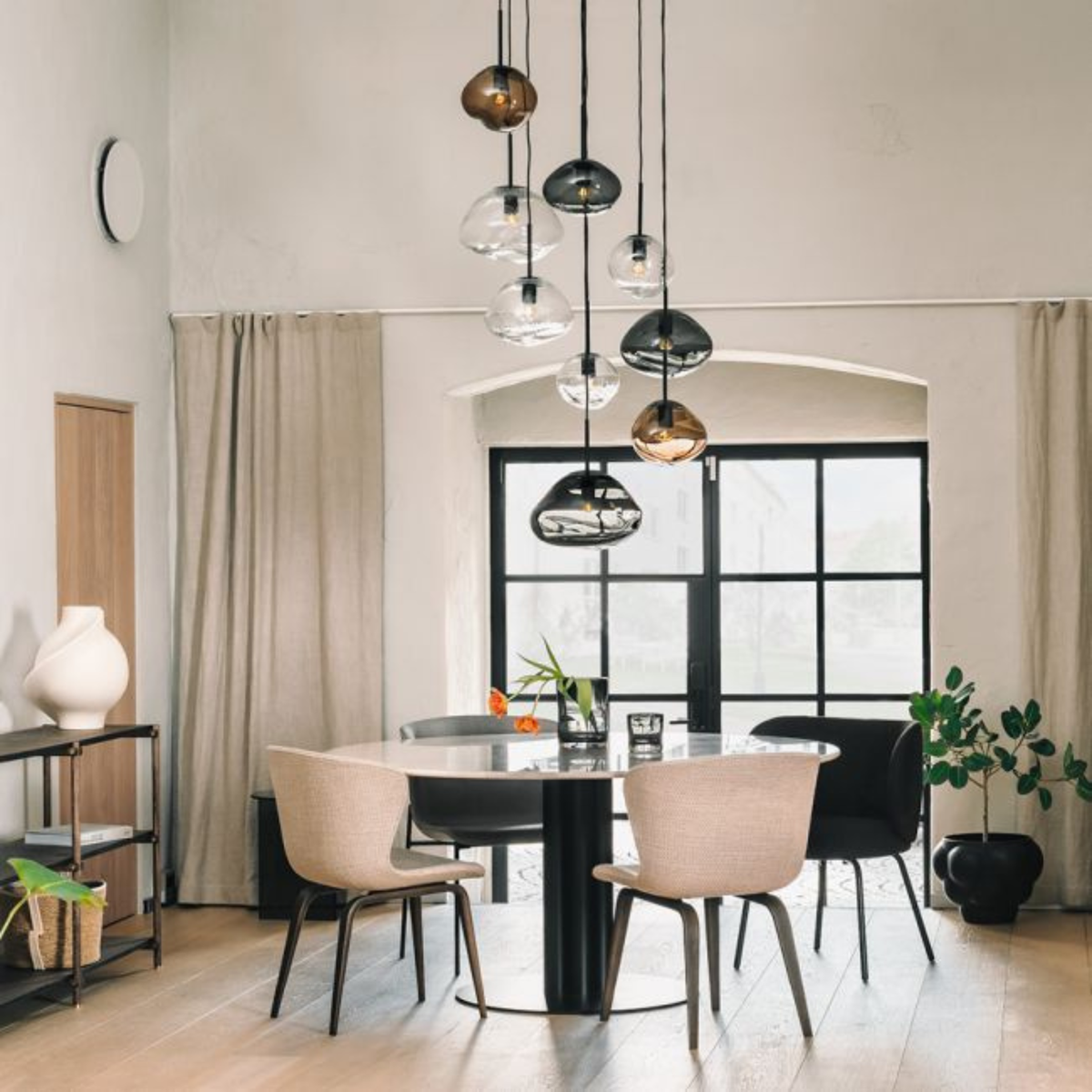 Nyt en sofistikert og elegant atmosfære med røkgrå glasspendellampe.