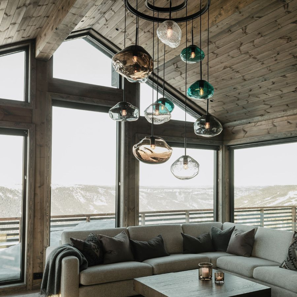 Assosiasjoner til klare sjøer og glitrende isbreer. Alle lampene er munnblåst og den organiske formen skapes når glassmassen er varm, dette gjør at hver eneste kuppel blir unik.