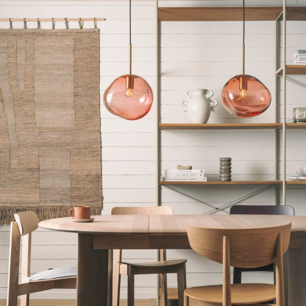 Skap en varm og innbydende atmosfære med morgenrød glasspendellampe.