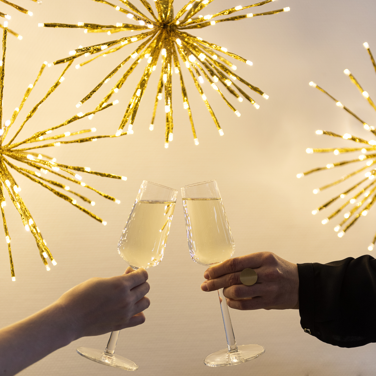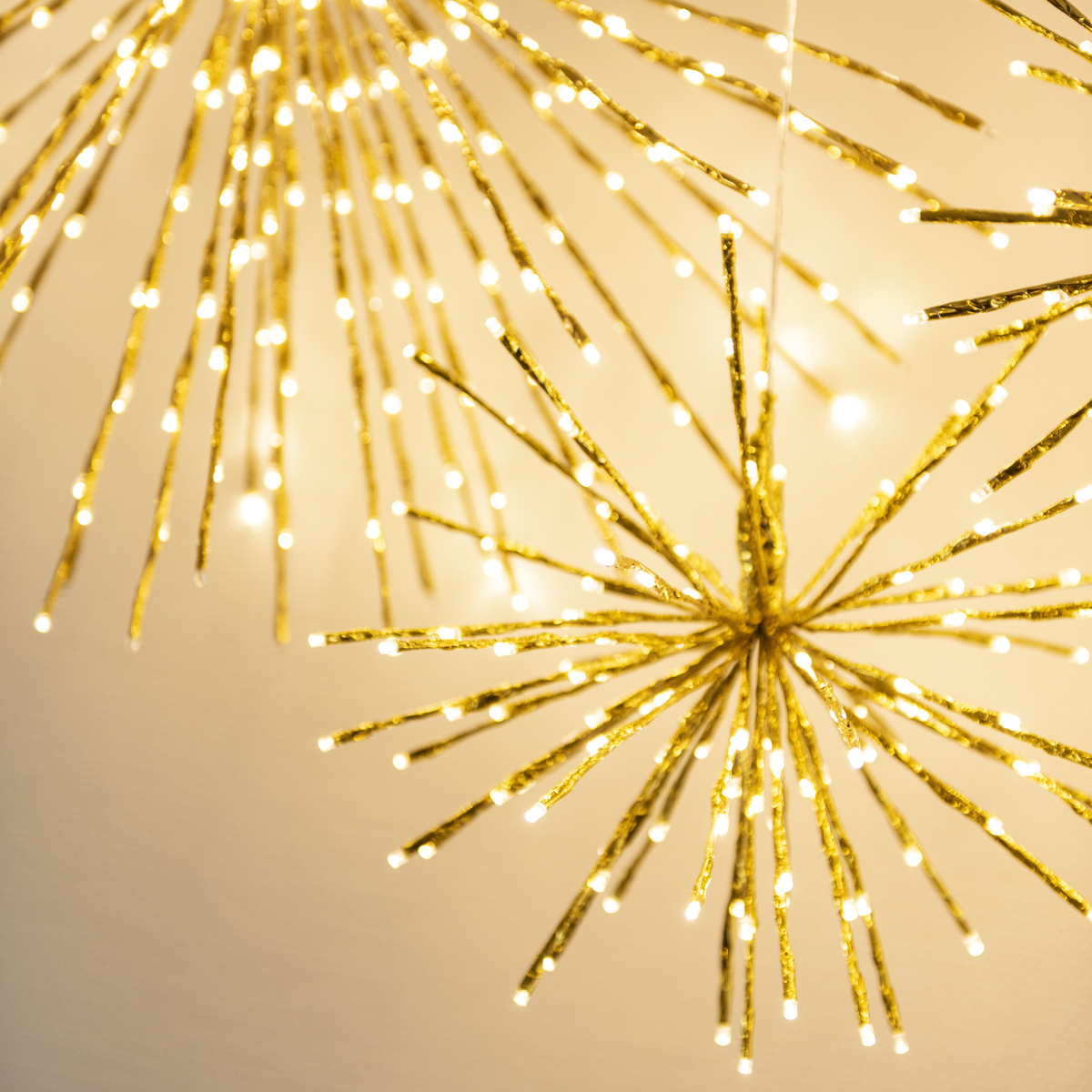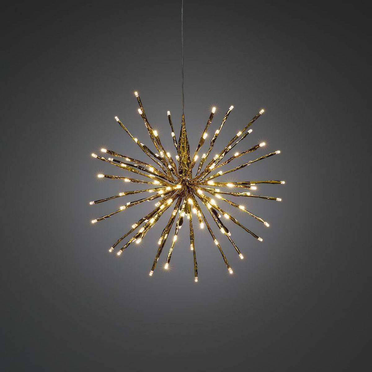 Stor lysball i gull med 120 varmhvite LED. Ballen er 40 cm i diameter. Ballen kommer flatpakket og foldes ut til bruk.
