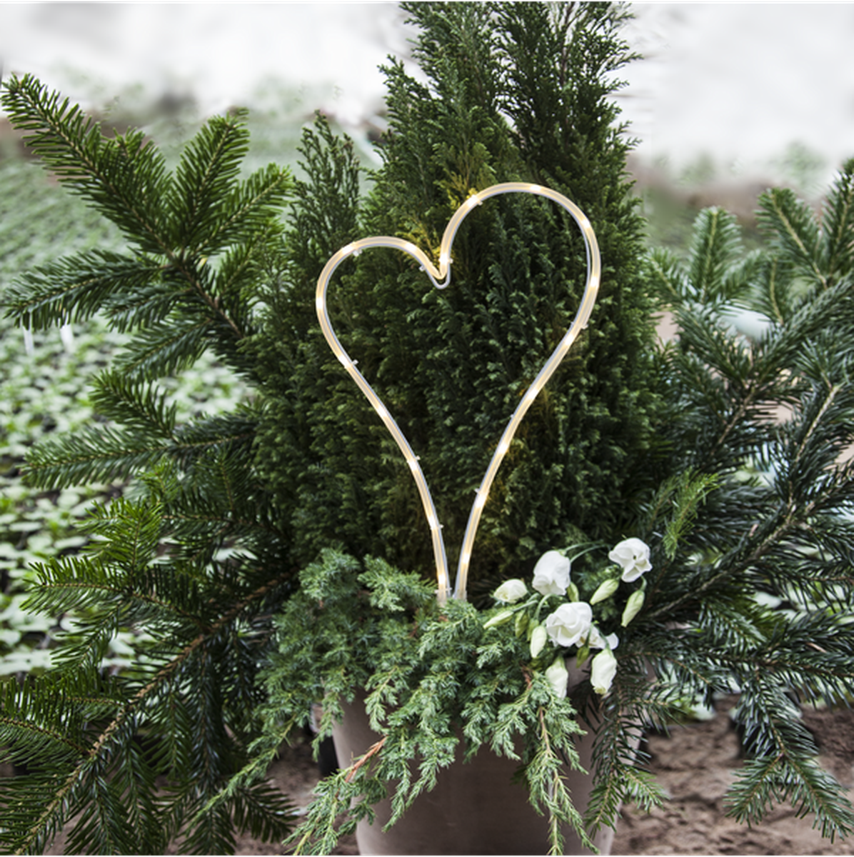 Vakkert lysende utendørshjerte i lysslynge med varmt hvitt lys. Hjertet er batteridrevet, og den innebygde timerfunksjonen gjør det enkelt å stille inn når produktet skal lyse.