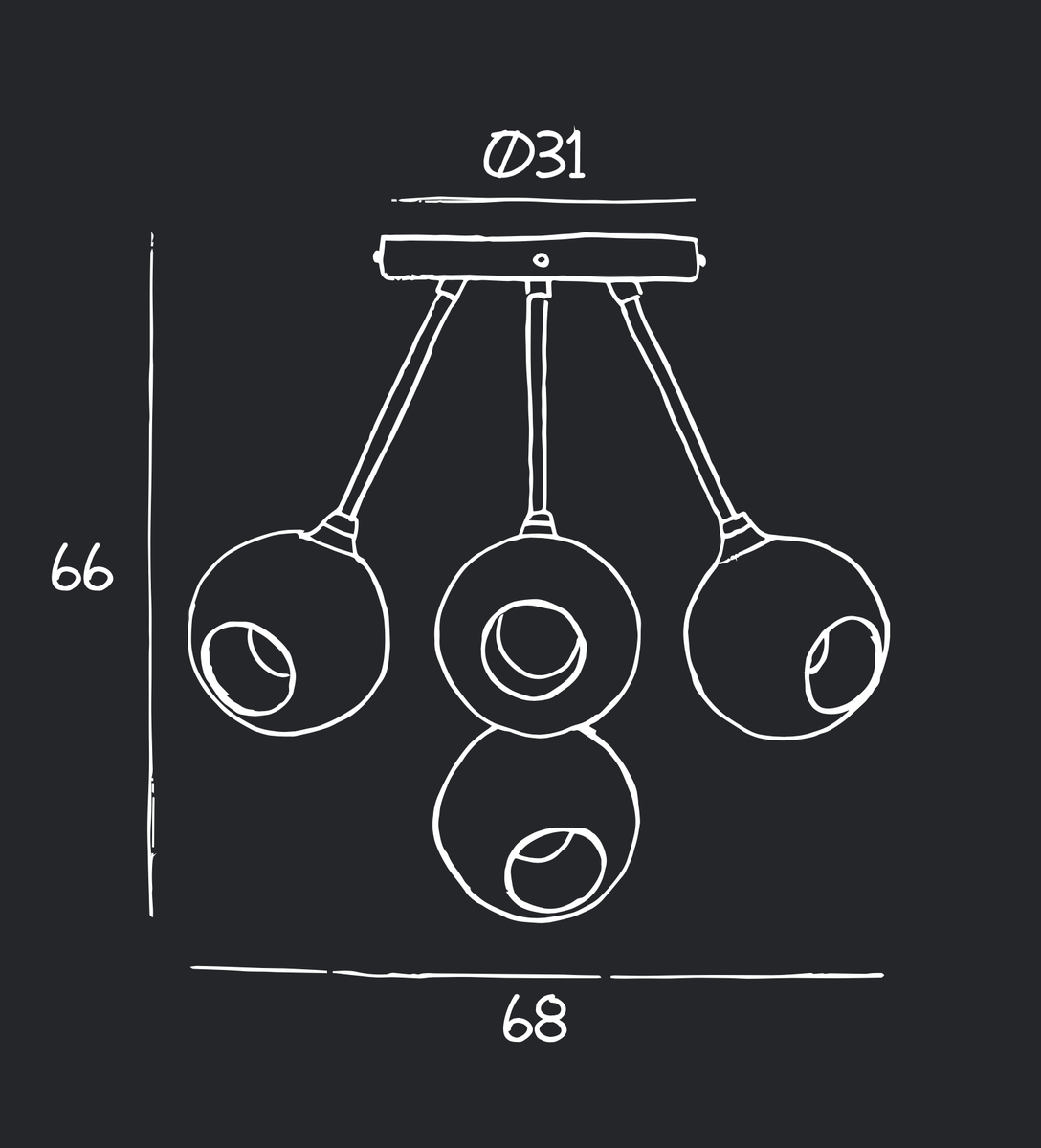 Ballroom Molecule lysekronen fra Design By Us er deres tolkning av en moderne og funksjonell lysekrone. Dette er kronjuvelen til Ballroom-serien, i form av en femarmet lysekrone som skiller seg ut hvor som helst. Ballroom Molecule taklampe er en dekorativ lampe med munnblåst- og håndmalt glass. Den fine kanten i glasset er håndmalt. Ballroom har et elegant uttrykk og skaper en behagelig belysning. Taklampen er perfekt å ha hengende i gangen, stuen, soverommet eller i ett rom hvor du ønsker vakker belysning. Vær oppmerksom på at lampen selges uten lyspærer. Fem lyspærer kreves for denne lampen.