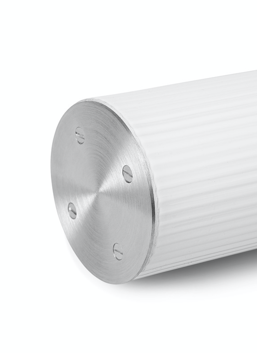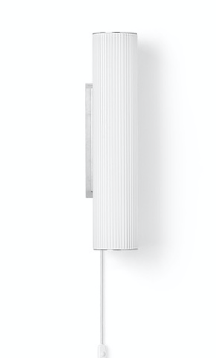 Vuelta vegglampe fra Ferm Living smelter sammen kompleksitet med moderne enkelhet og har sylindrisk opalt glass med en tydelig rillet overflate og detaljer i stål. Lampen har en LED-lyskilde som avgir et mykt, diffust lys. Det medfølger en fjernkontroll som dimmer lyset for optimal atmosfære i rommet. En fantastisk vakker lampe å bruke på baderom ved speil.