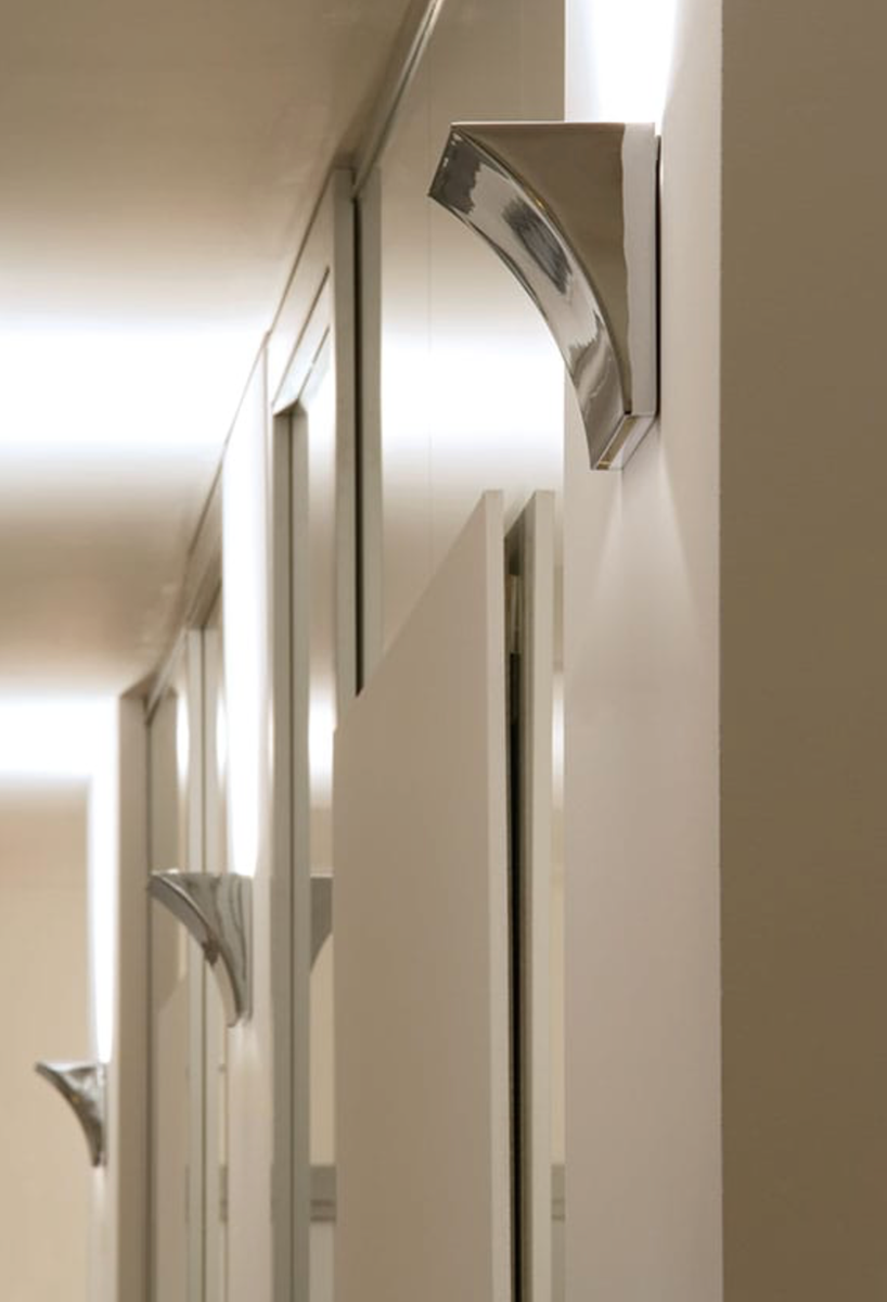 Pochette vegglampe er en lekker uplight med strømlinjeformer. Her har du en tidløs lampe som gir et godt indirekte lys, da lyset reflekteres ut i rommet. Den er fin å dimme og med 20 watt LED på full styrke er du sikret et godt generelt lys som bærer ut i rommet. Vegglampe som gir direkte/indirekte belysning. Struktur i trykksprøytestøpt Zamak-legering, matt grå, skinnende hvit eller forkrommet finish. Hvitt veggfeste i støpt, galvanisert stål som inneholder både veggfestesystemet og de elektriske enhetene.