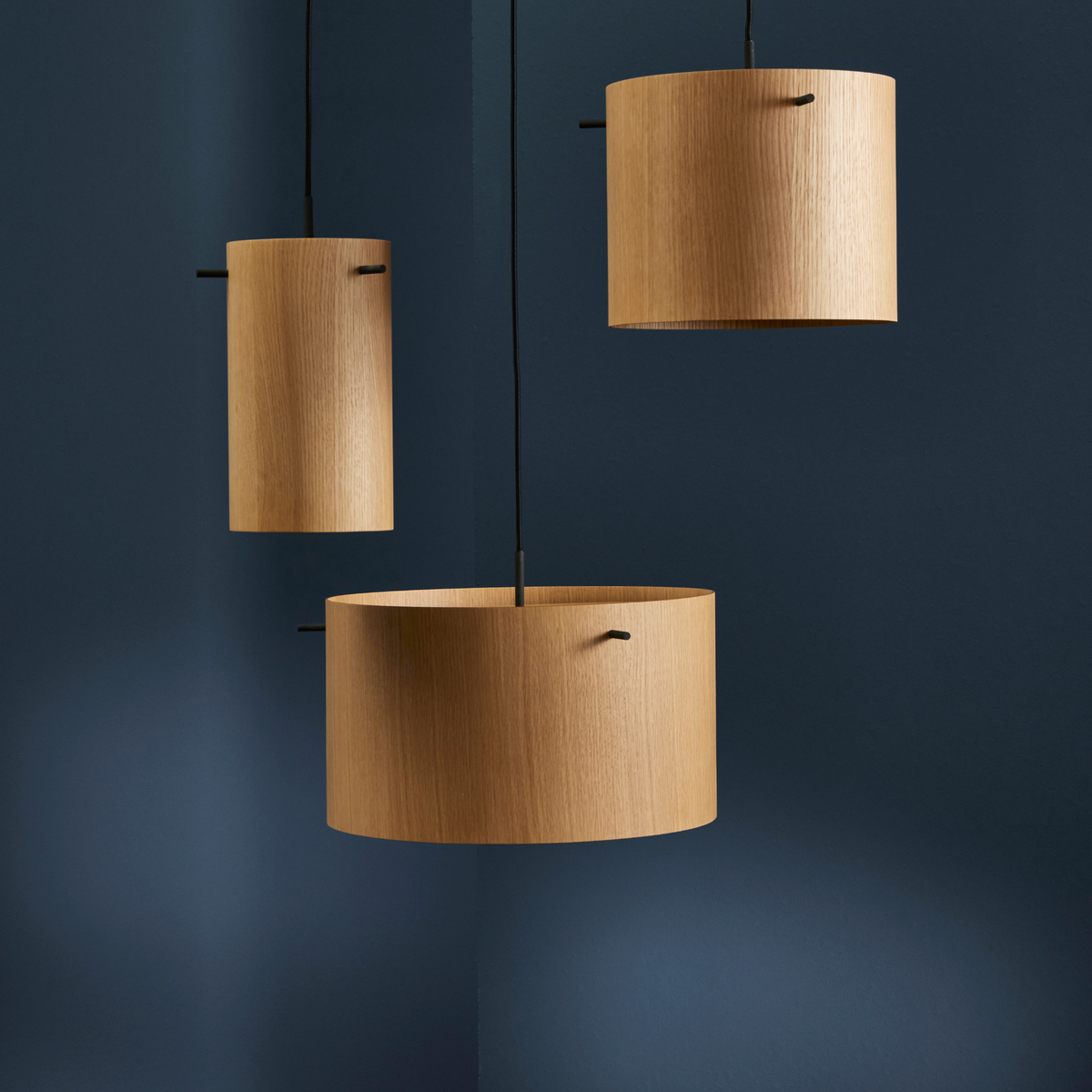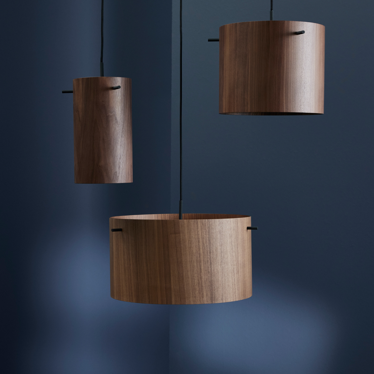 FM1954 Pendel er tilgjengelig i tre størrelser og tre farger – svart, hvit og grå/sand struktur. Leveres med en sort stoffledning og svart baldakin.
