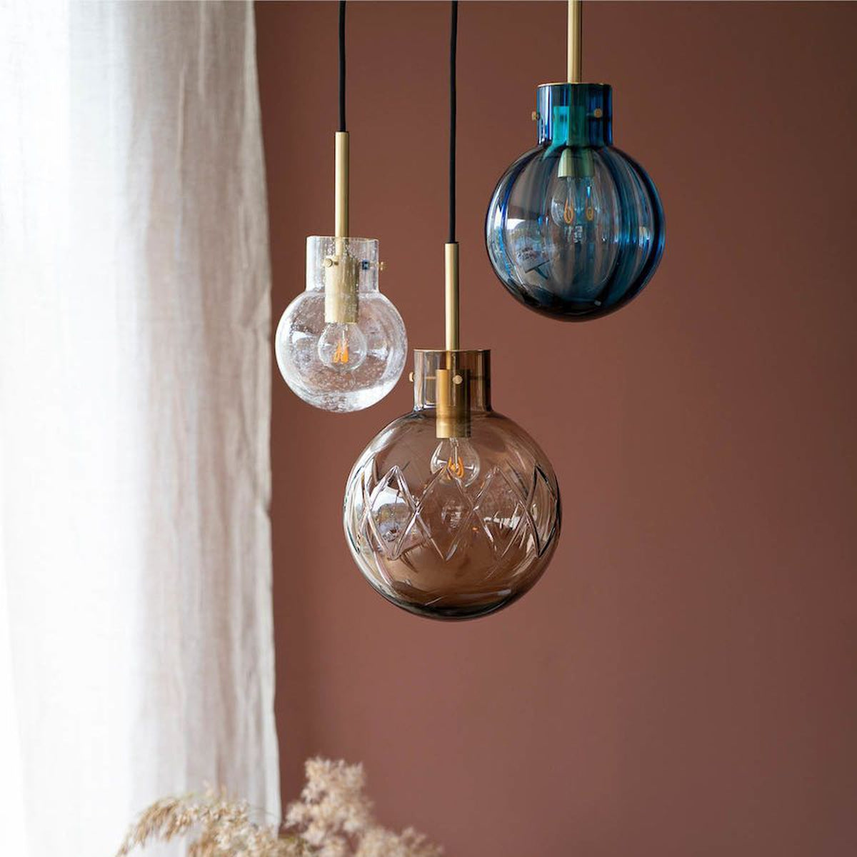 I denne kombinasjonen er det brukt følgende krystallkuler: Kryss morgenrød 200 mm, optikk klar 160 mm og soda varmgul 120 mm. Messingoppheng til 3 krystallkuler med sort tekstiltrukket kabel på 3 meter. Hvit rund takbaldakin 34cm.