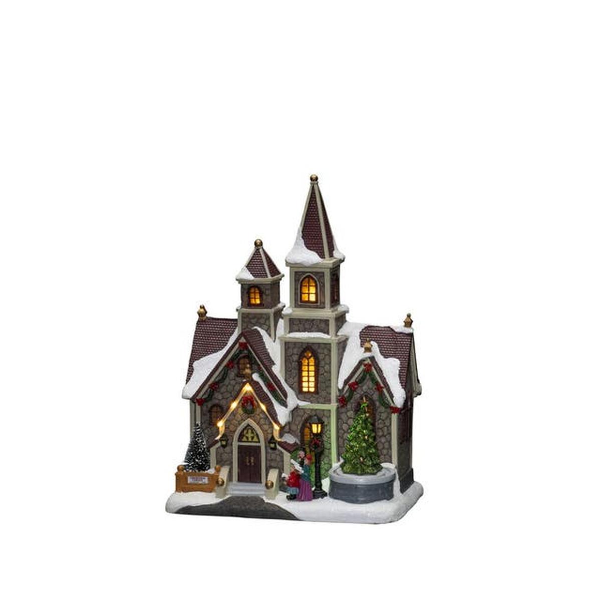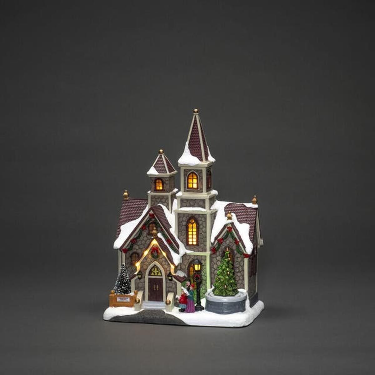 Hus med roterende juletre, musikk og LED-lys. Julelandsby drevet av 3xAA (ikke inkludert) og USB. 1,8 m USB-kabel inkludert.