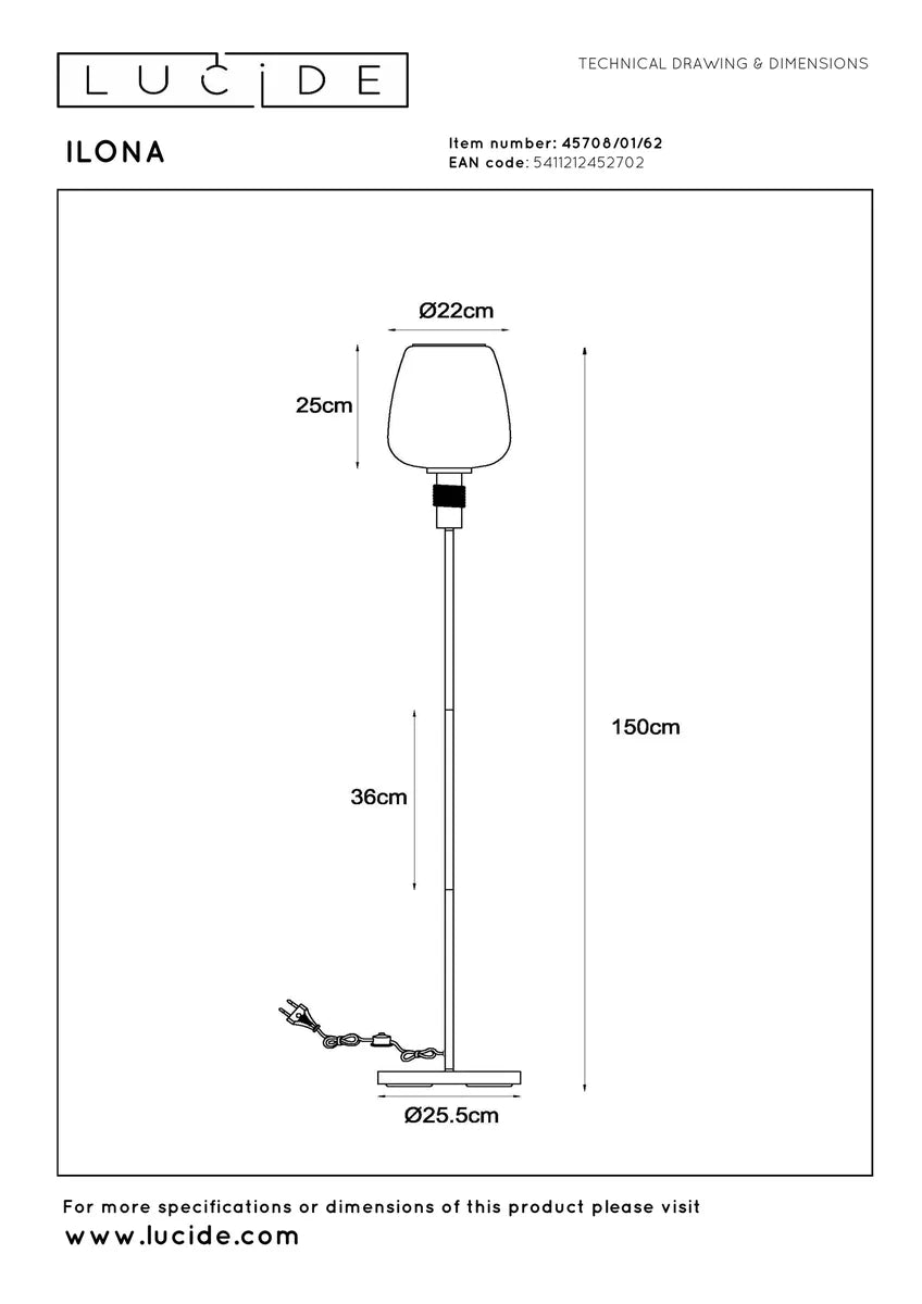 Den organiske silhuetten, med en diameter på 34 centimeter, skaper en innbydende og behagelig atmosfære i rommet. Ilona er 150 centimeter høy, leveres med en kabel på 200 centimeter, og er kompatibel med LED-lyskilder.