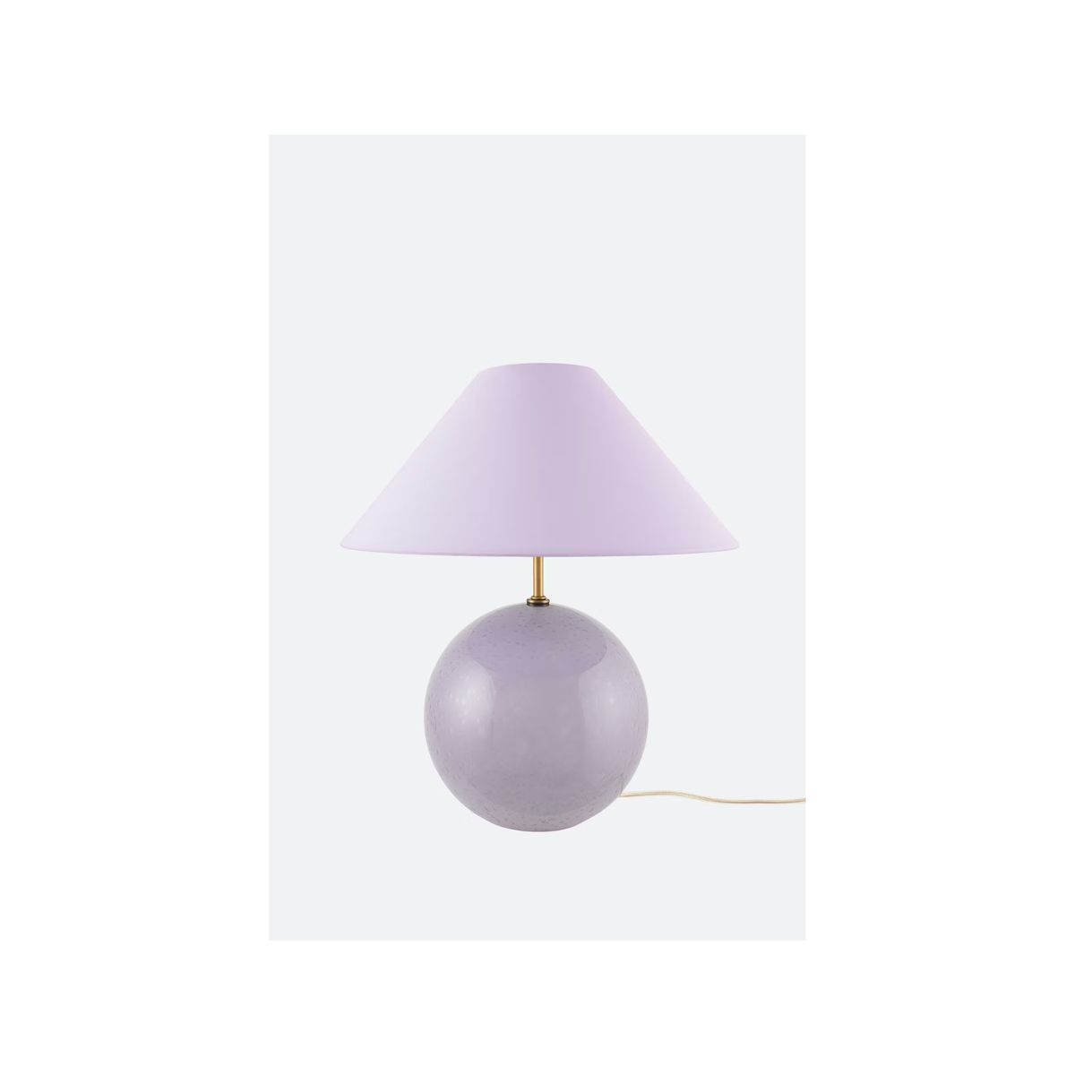 Ved å legge til noen moderne detaljer som lampefoten i farget glass, med detaljer som uregelmessige blåste bobler og en matchende lampeskjerm i bomull med dekket topp som går ton-i-ton med lampefot føles lampen som en naturlig interiørdetalj i mange moderne interiører.