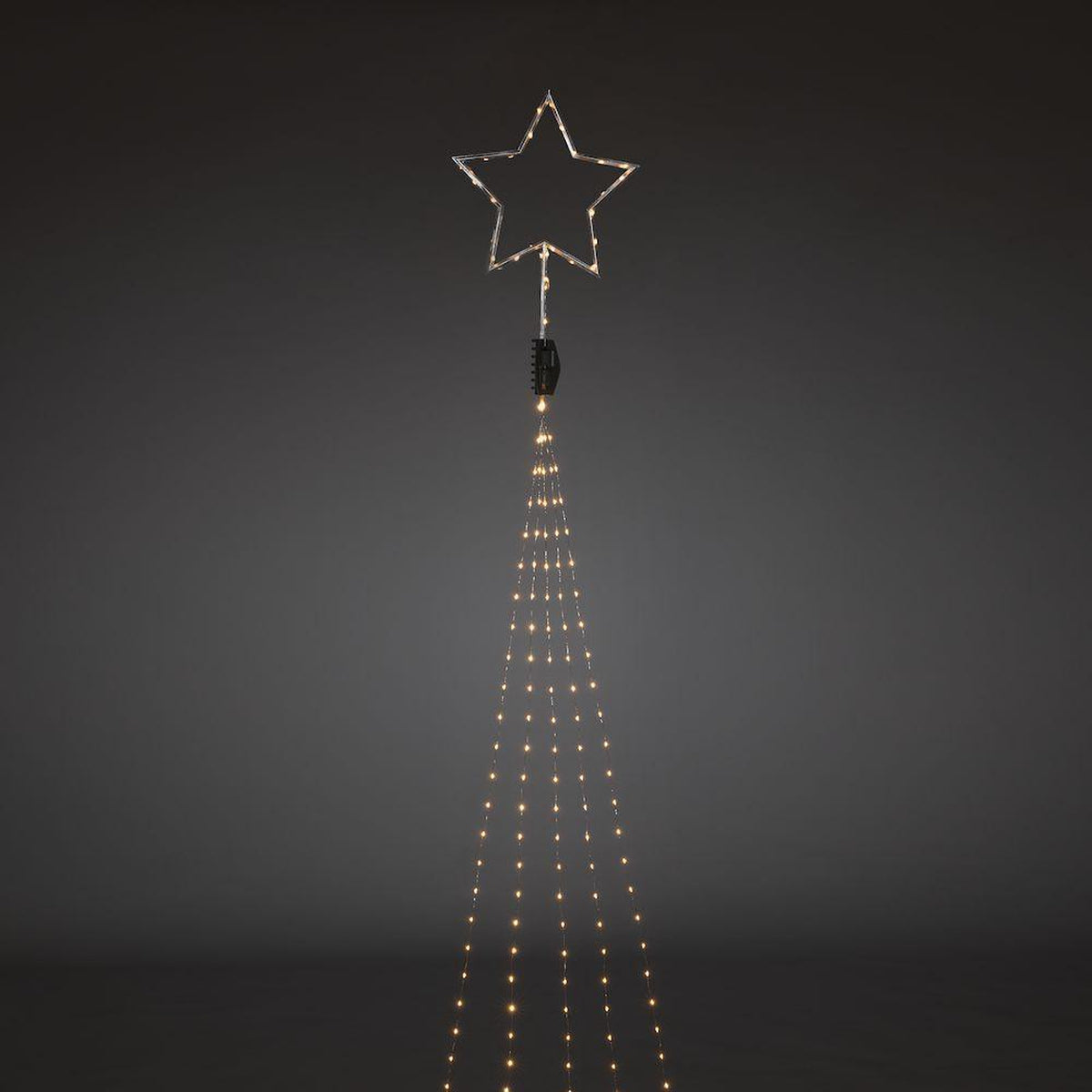Tpppstjernen festes i toppen av treet med en klype, og ut fra denne går det 5 slinger med 274 amber LED. Slyngen er i metalltråd med innstøpe LED dioder. Fest stjernen i toppen og draper enkelt slyngene ned fra denne.