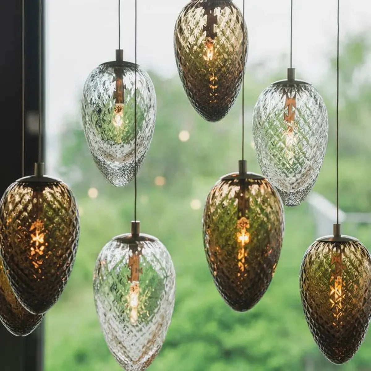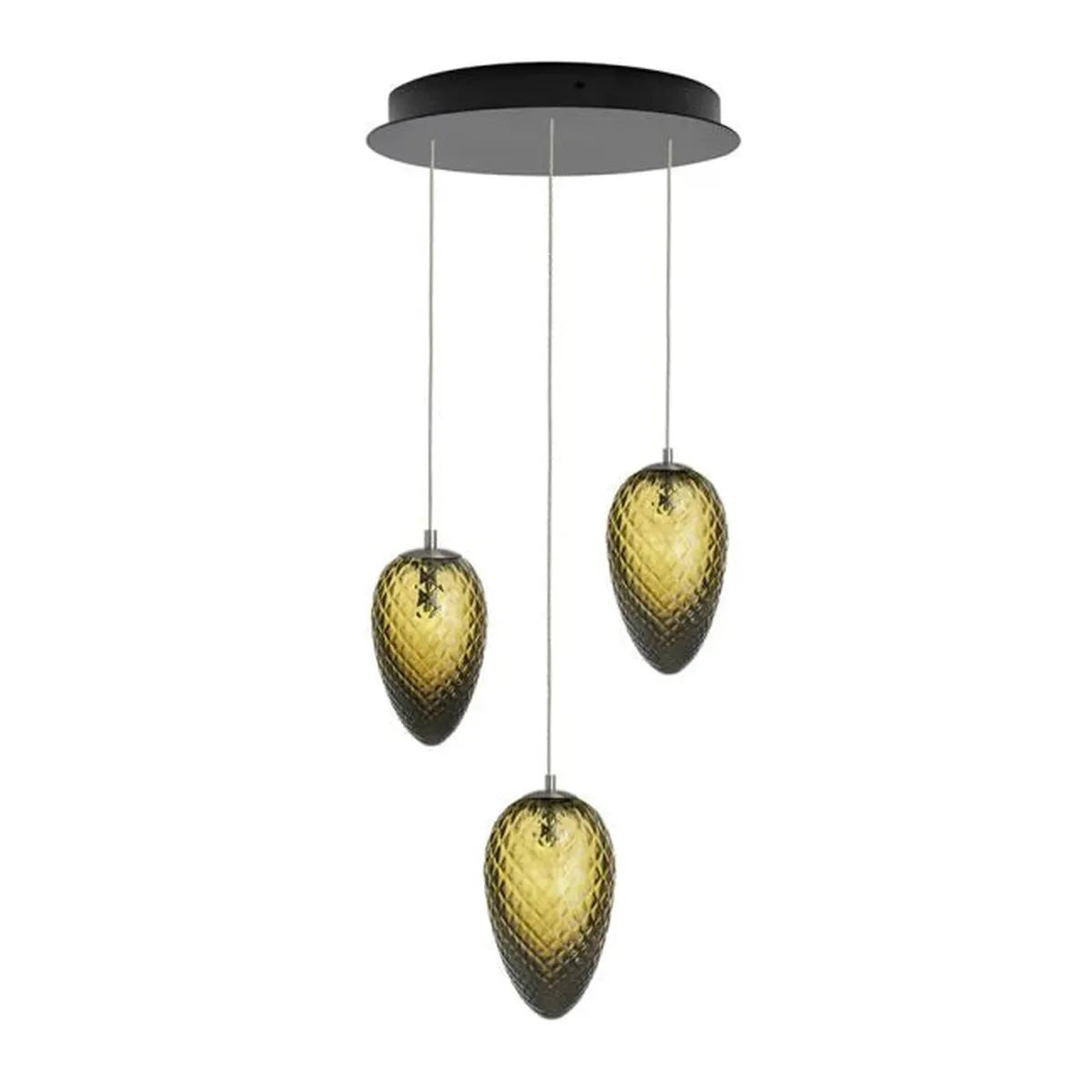 Inneholder 3 munnblåste kongler i oliven farget glass, i størrelsene 17cm, 21cm og 23cm.