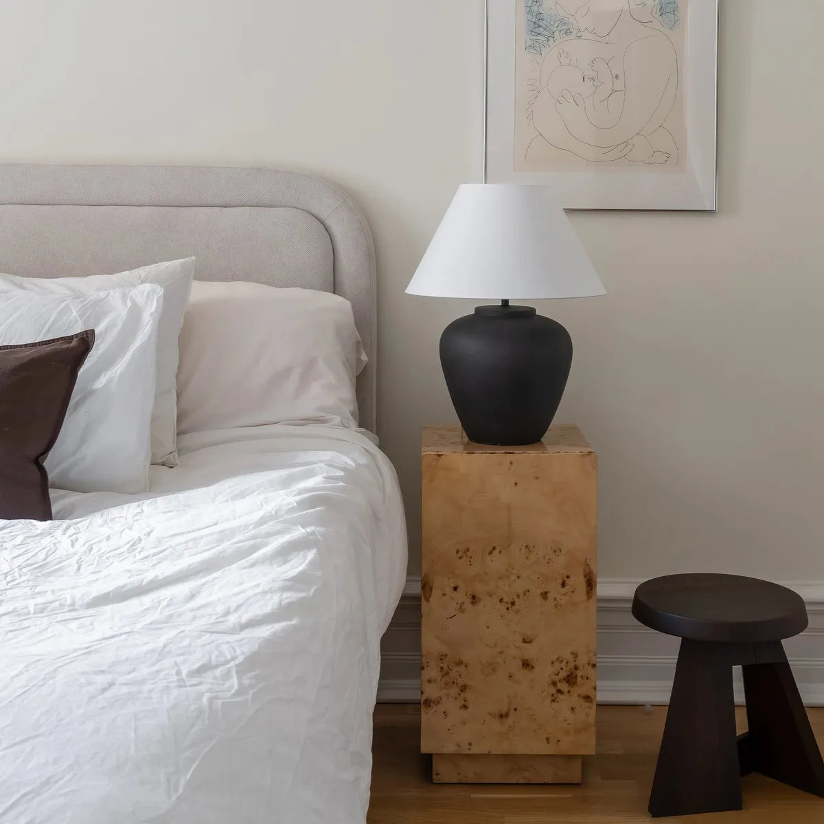 Lilly keramisk bordlampe. Bordlampen er håndlaget og designet med en vakker urneform. Den vintage- og skulpturerte effekten gjør hver lampe unik, derfor kan finishen variere mellom lampen på bildet og den du mottar. Den har en linskjerm med konisk form. Svart ledning med bryter og EU-veggplugg. E27-pæreholder. Lampehodet er leddet for horisontal justering av lampeskjermen