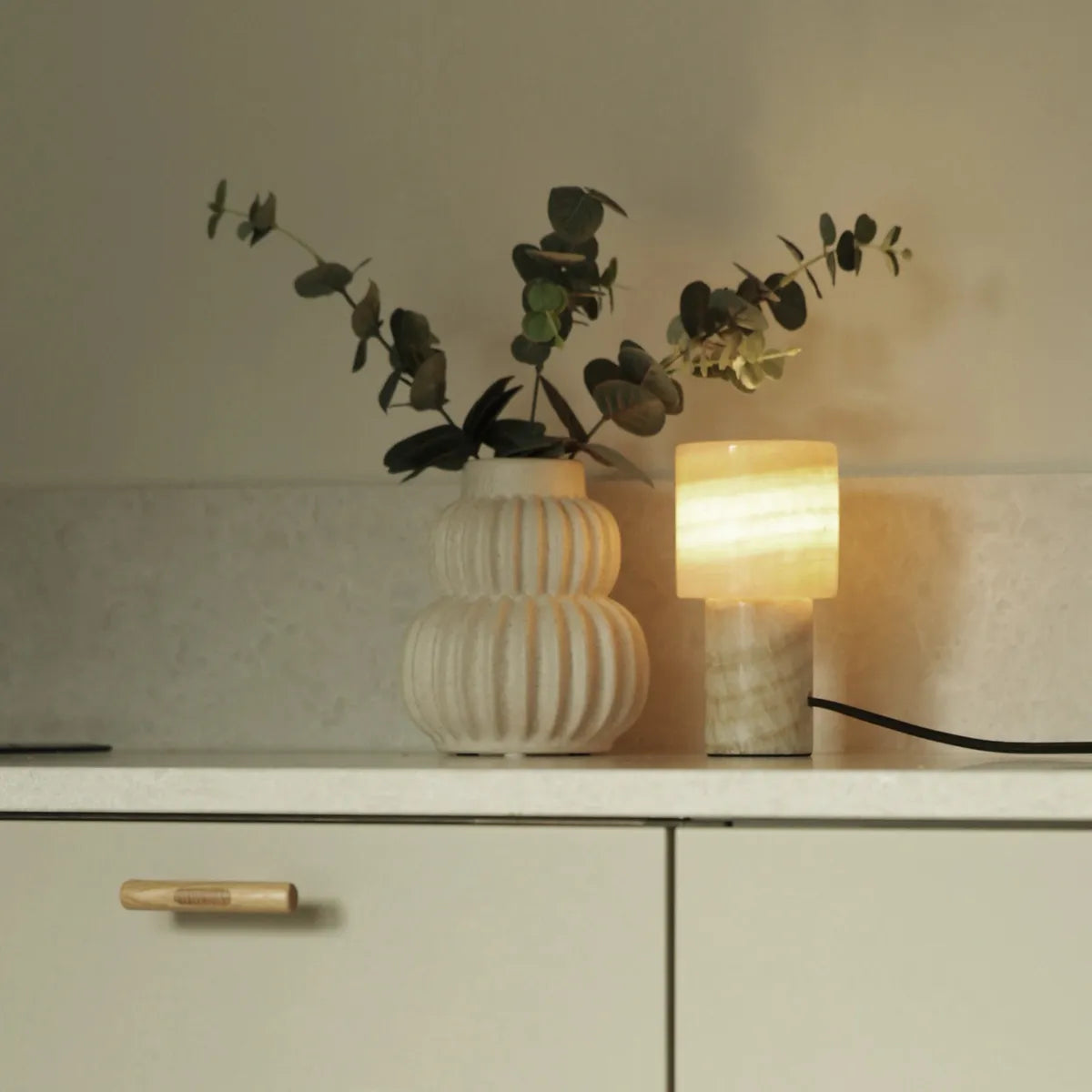 Bordlampe laget av marmor, med G9-lampefot, 1,5 m svart tekstilkabel med bryter og europlugg. Når den er tent, gir denne lampen en varm og behagelig fargetone. Siden marmor er et naturlig materiale, er ikke mønstrene helt like for hver lampe.