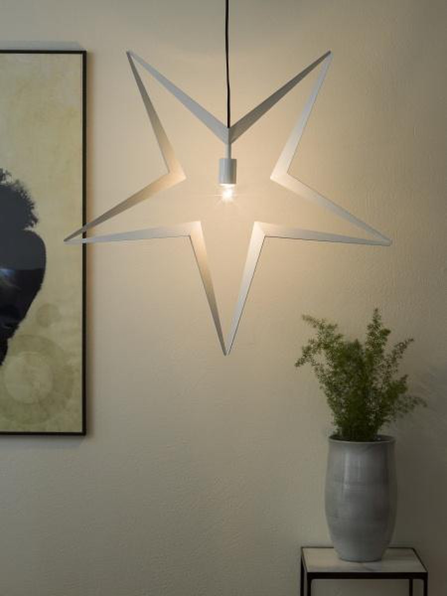 Stor og flott metallstjerne med mørk grå tekstilledning. Du behøver en LED-lyspære med E27-sokkel til stjernen.