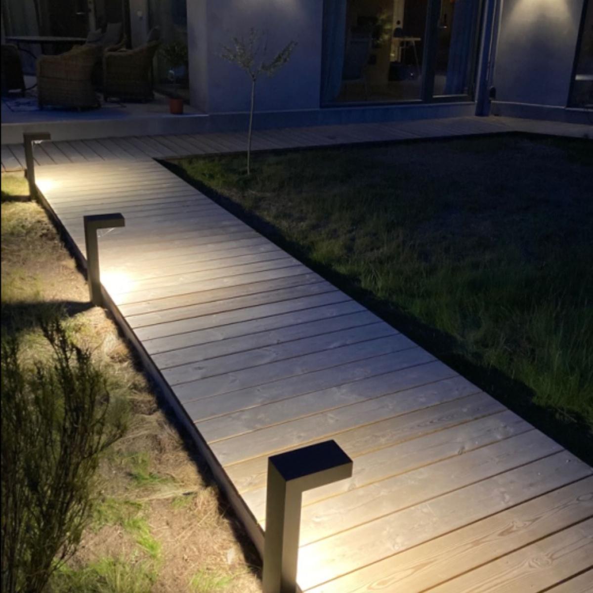 Stilren pullert i pulverlakkert aluminium. Blendfri armatur med indirekte lys.