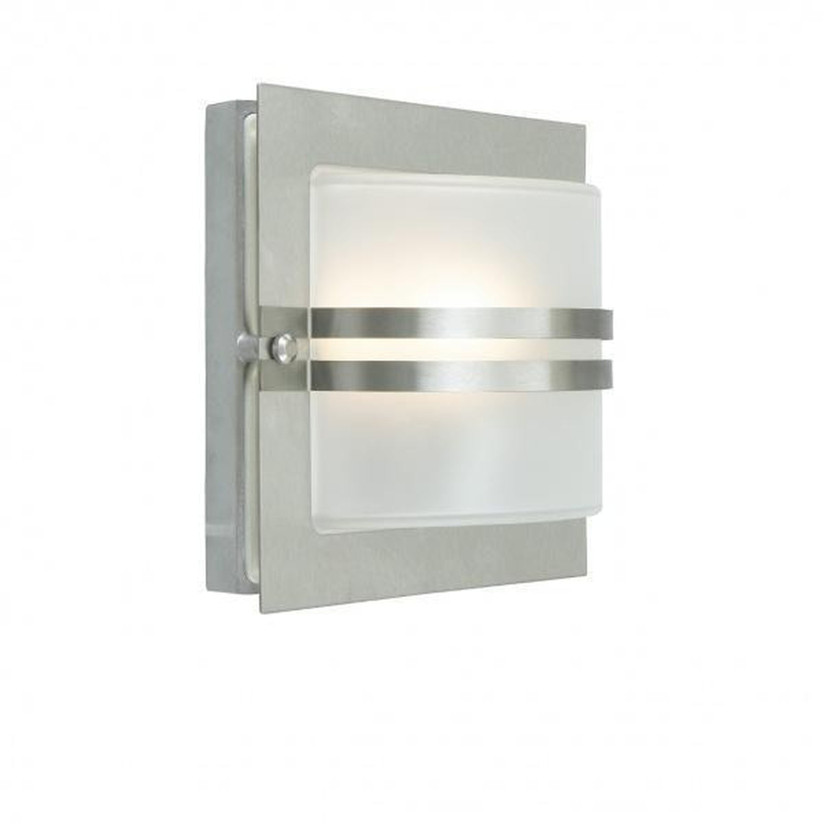 Vegglampe i moderne design for utendørsbruk. Leveres med frostet glass. Lampens materiale er galvanisert stål, som er vedlikeholdsfritt. Du behøver en lyspære med E27-sokkel til lampen.
