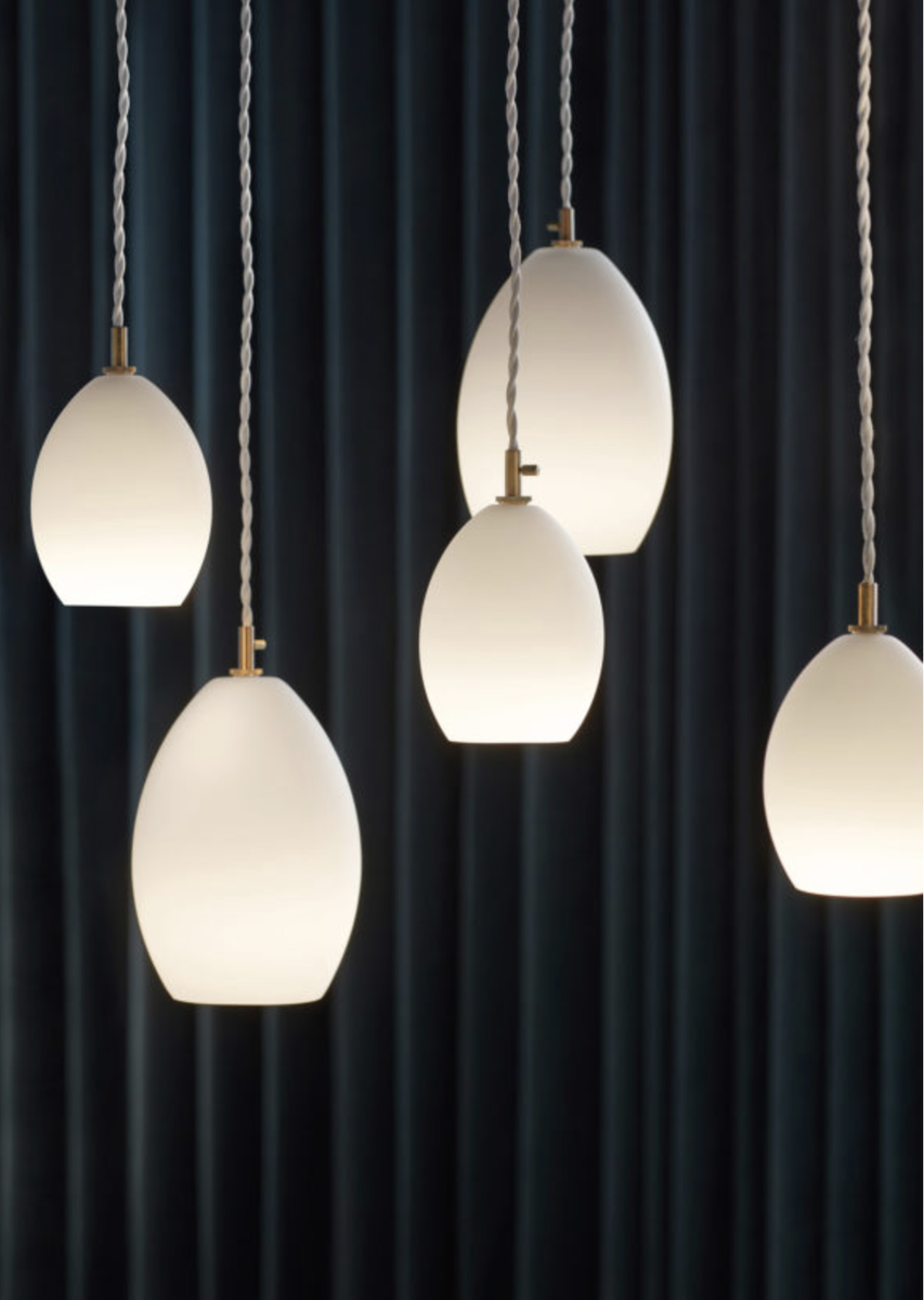 Unika pendlene ble designet i 2012 av designduoen Anne Louise Due de Fønss & Anders Lundqvist. Nydelig munnblåst glass, messingdetaljer og sort tekstilledning. Fin å bruke alene eller sammen med flere. Gir generell belysning.