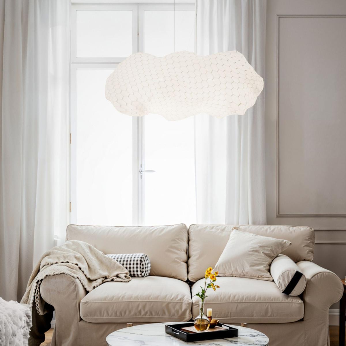 Taklampe Nuevo – en svevende skjønnhet med myke former. Taklampe Nuevo er en feminin og elegant videreføring av vår populære Hayden-lampe. Med sin unike form, skapt av et formet nett som minner om en drømmende sky, tilfører Nuevo et mykt og svevende uttrykk til rommet.
