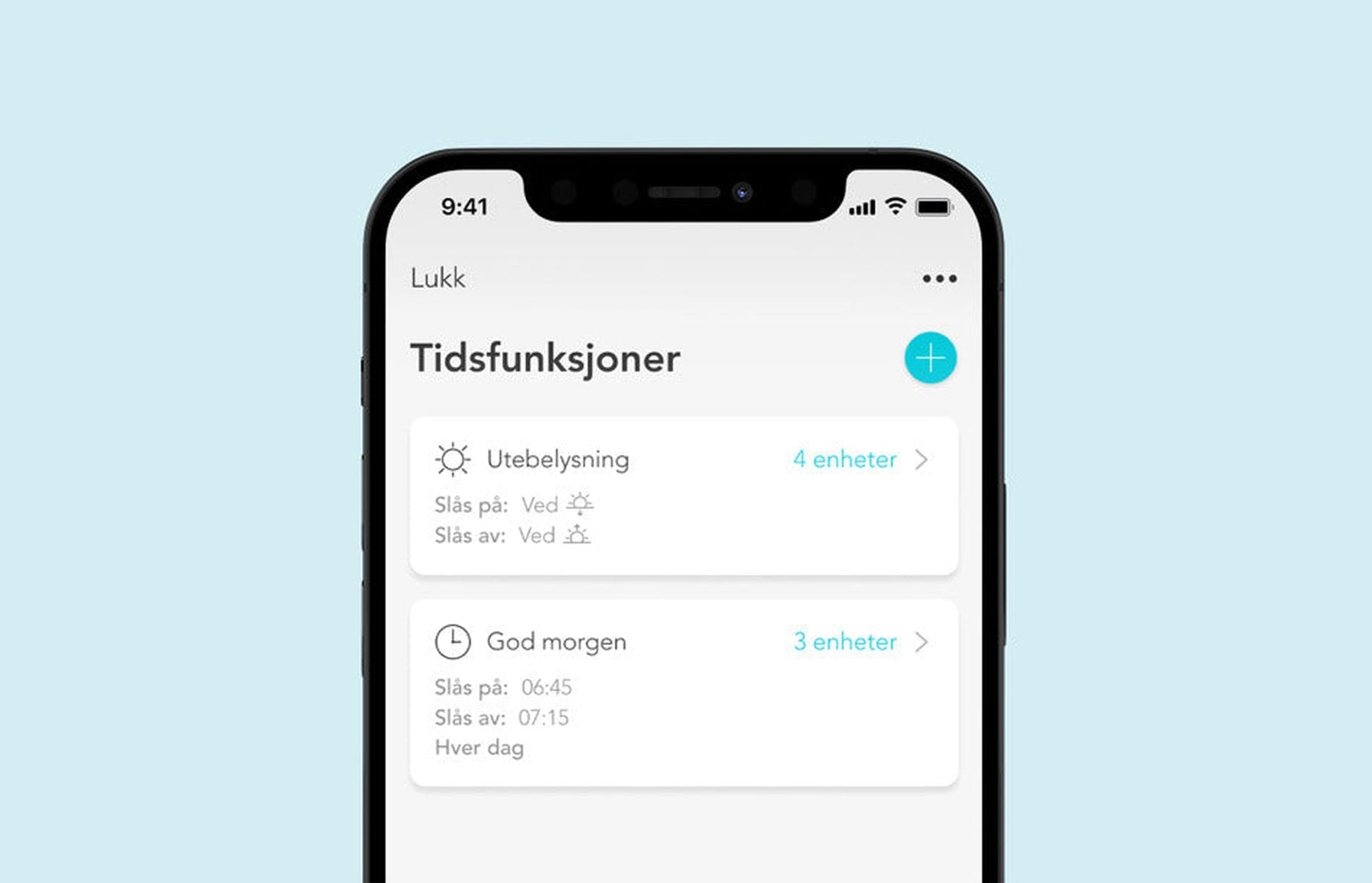 La belysningen følge soloppgang og solnedgang, eller tenn og slukk lamper på et bestemt tidspunkt. Alle produktene våre har innebygd astro- og ukesur, noe som gjør enkel planlegging mulig.
