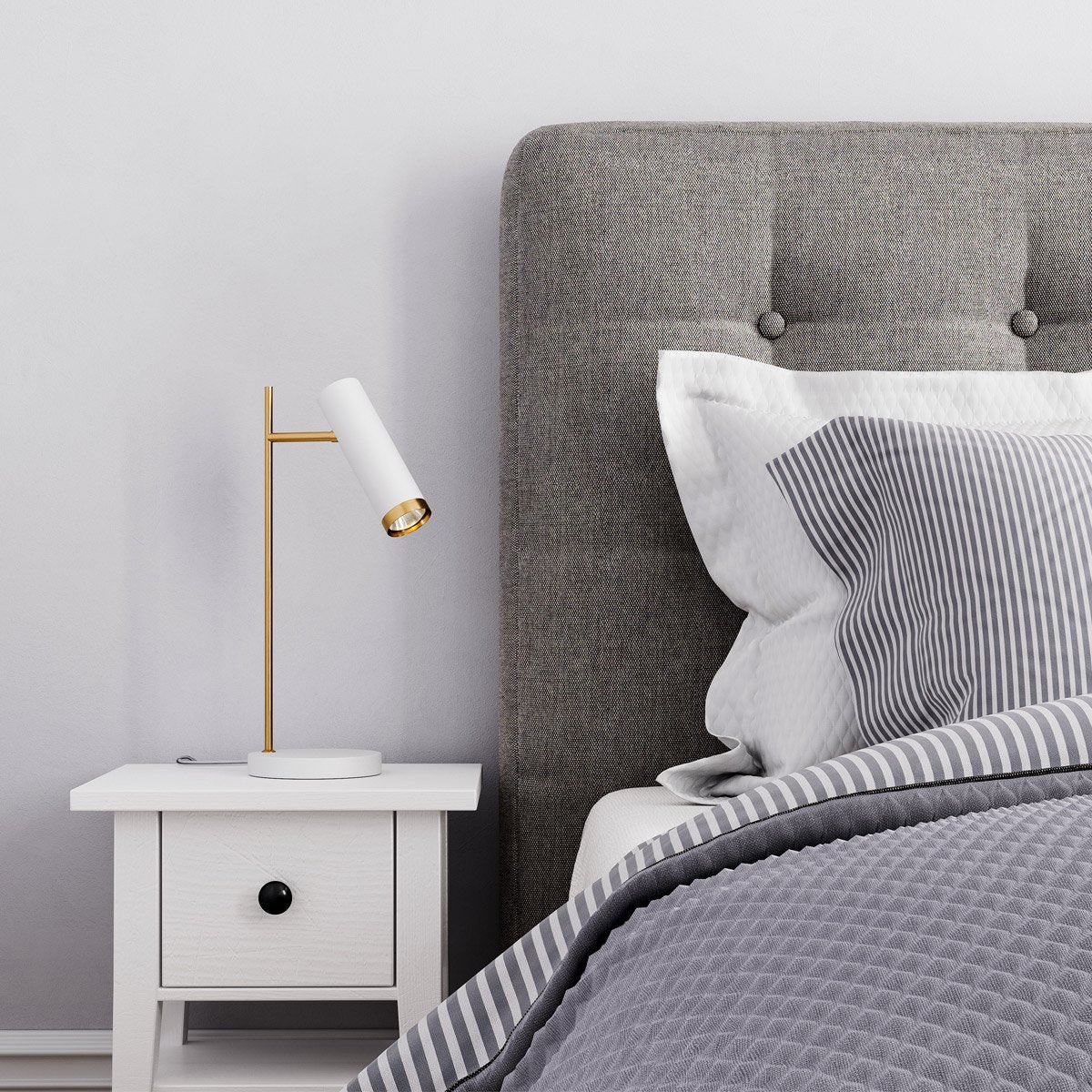 Puls bordlampe er en ultramoderne bordlampe i minimalistisk stil, og med en geometrisk design som passer like bra som arbeidslampe på skrivebordet som den gjør som pynt i en hylle eller i et vindu. Det er lampen for deg som vil ha puls! Det hvite, sylinderformede lampehodet med gullfarget ring kan beveges, slik at du kan justere lyset i den retningen du ønsker. Konstruksjonen av gullfarget metall skaper et luksuriøst preg og går igjen i ringen på lampeskjermen. Puls finnes som hel serie, og hvis du er nysgjerrig, kan du titte videre på de andre produktene våre.