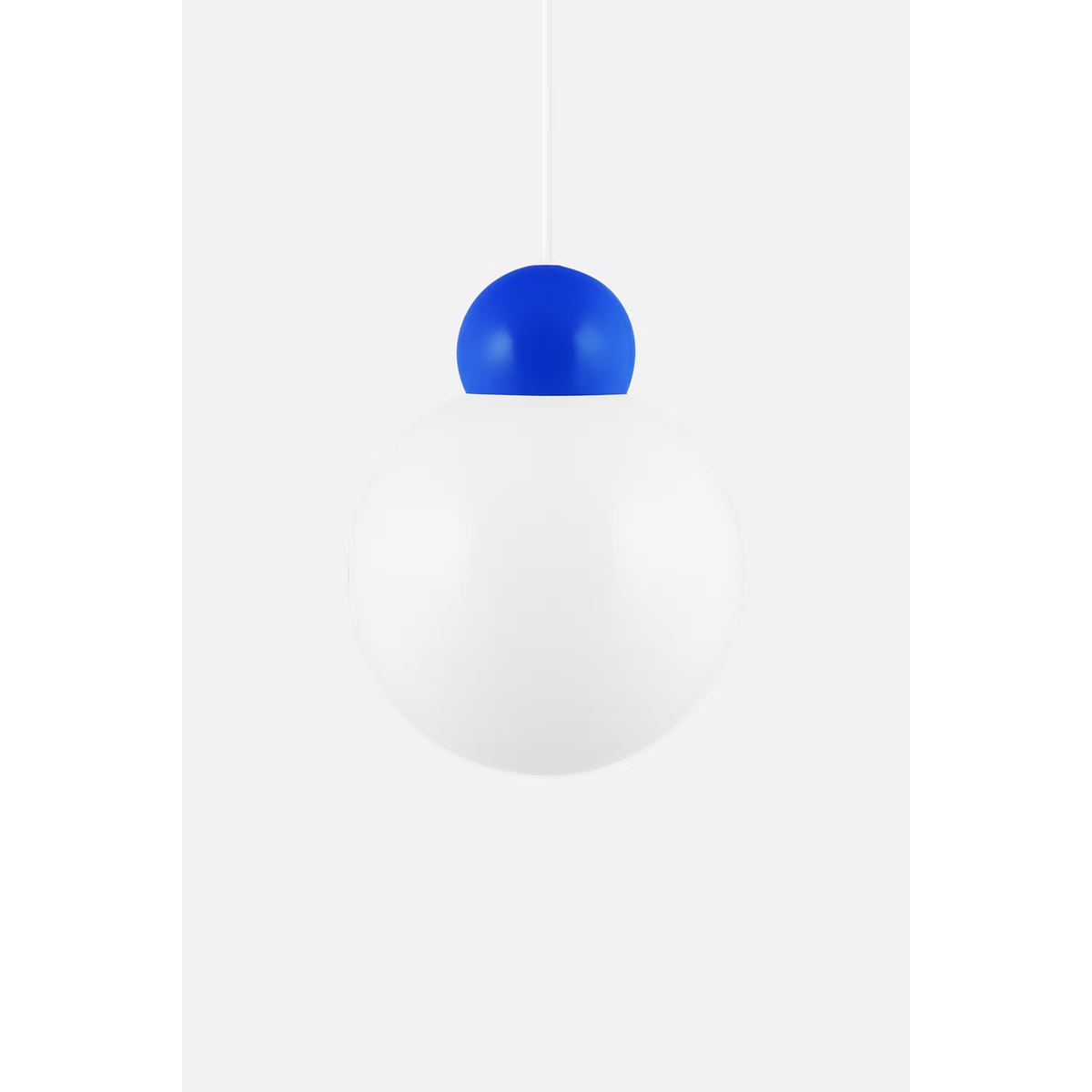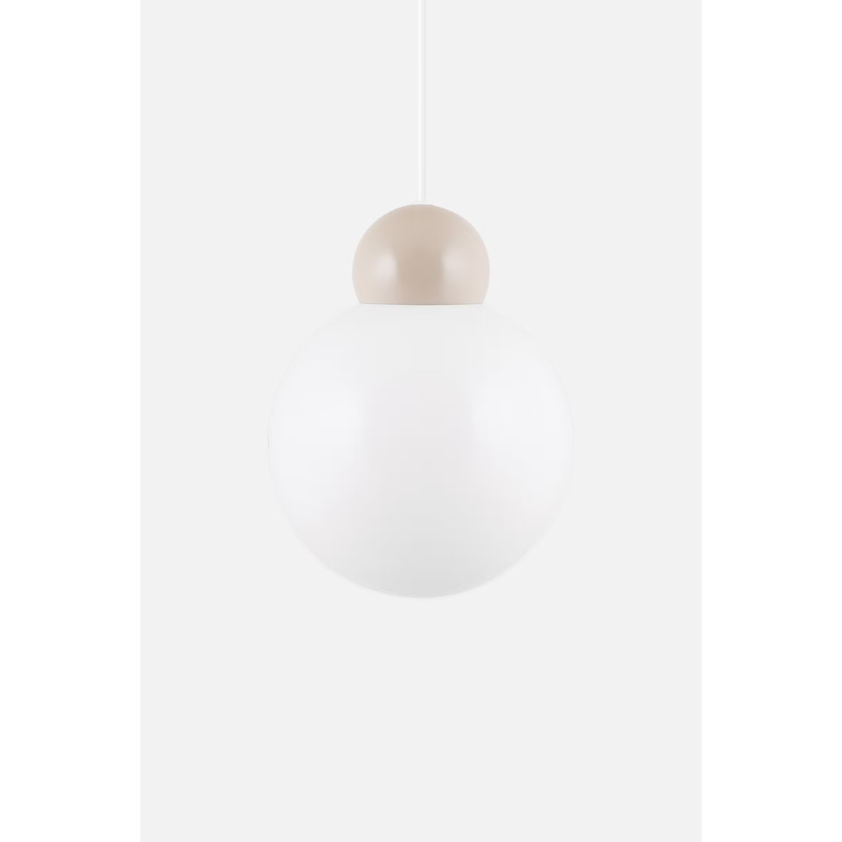 Lampen er laget av metall med skjerm i hvitt glass, har en 120 cm lang hvit tekstilkabel og en matchende takkopp av metall.