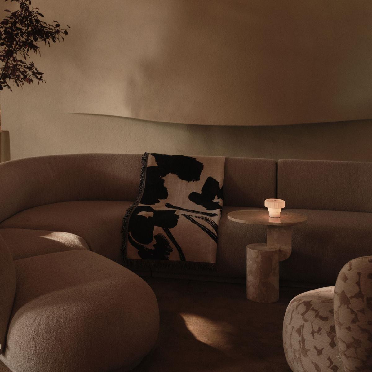 Legg til et mykt skjær i rommet med Ripple bærbar lampe. Laget av munnblåst glass med en bølget overflate og hvit opalfinish, gir den et varmt, diffust lys.