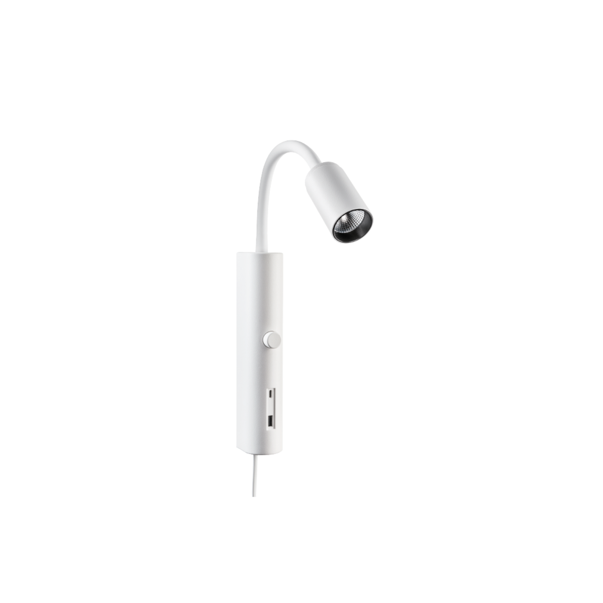 Tube vegglampe er en stilig veggmontert lampe med integrert dimmer og USB A+C-lader. Den er egnet som leselampe ved sengen i boliger, så vel som på hoteller og sykehus. Lampeskjermen kan fritt justeres med en bevegelig lampearm. Tube vegglampe leveres med svart ring som standard, med lavt gjenskinn. Andre ringer i hvitt og gull kan leveres som ekstrautstyr.