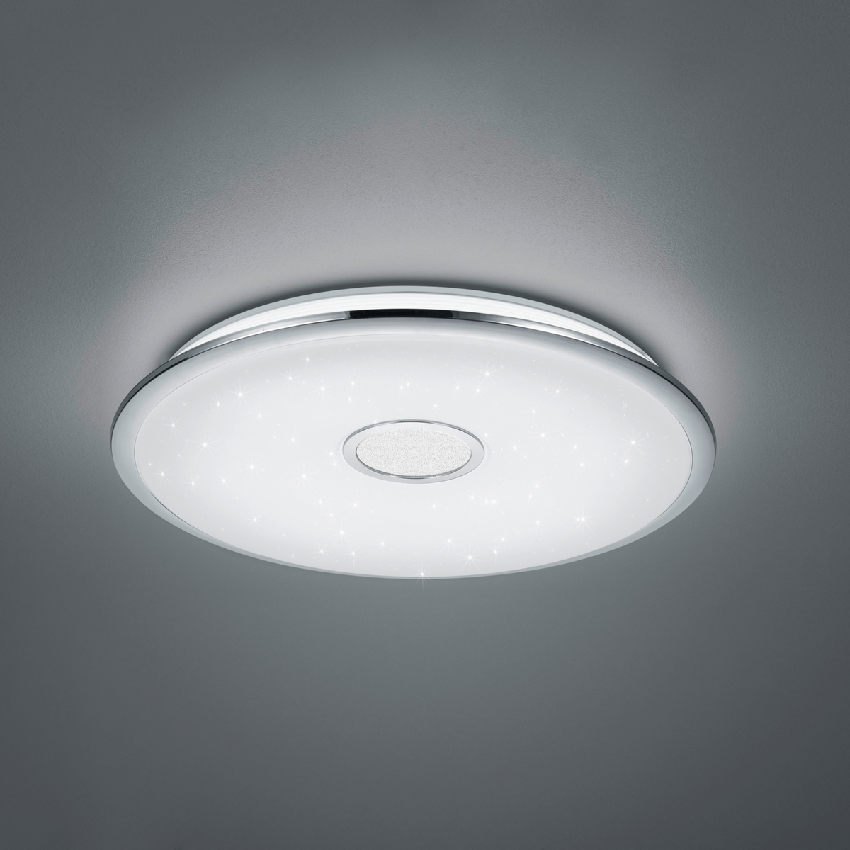 Taklampe som også kan brukes på vegg, med integrert dimmer og fjernkontroll, nattlysfunksjon, stjernelyseffekt, minnefunksjon, lysfargestyring og spesielt egnet for soverom.