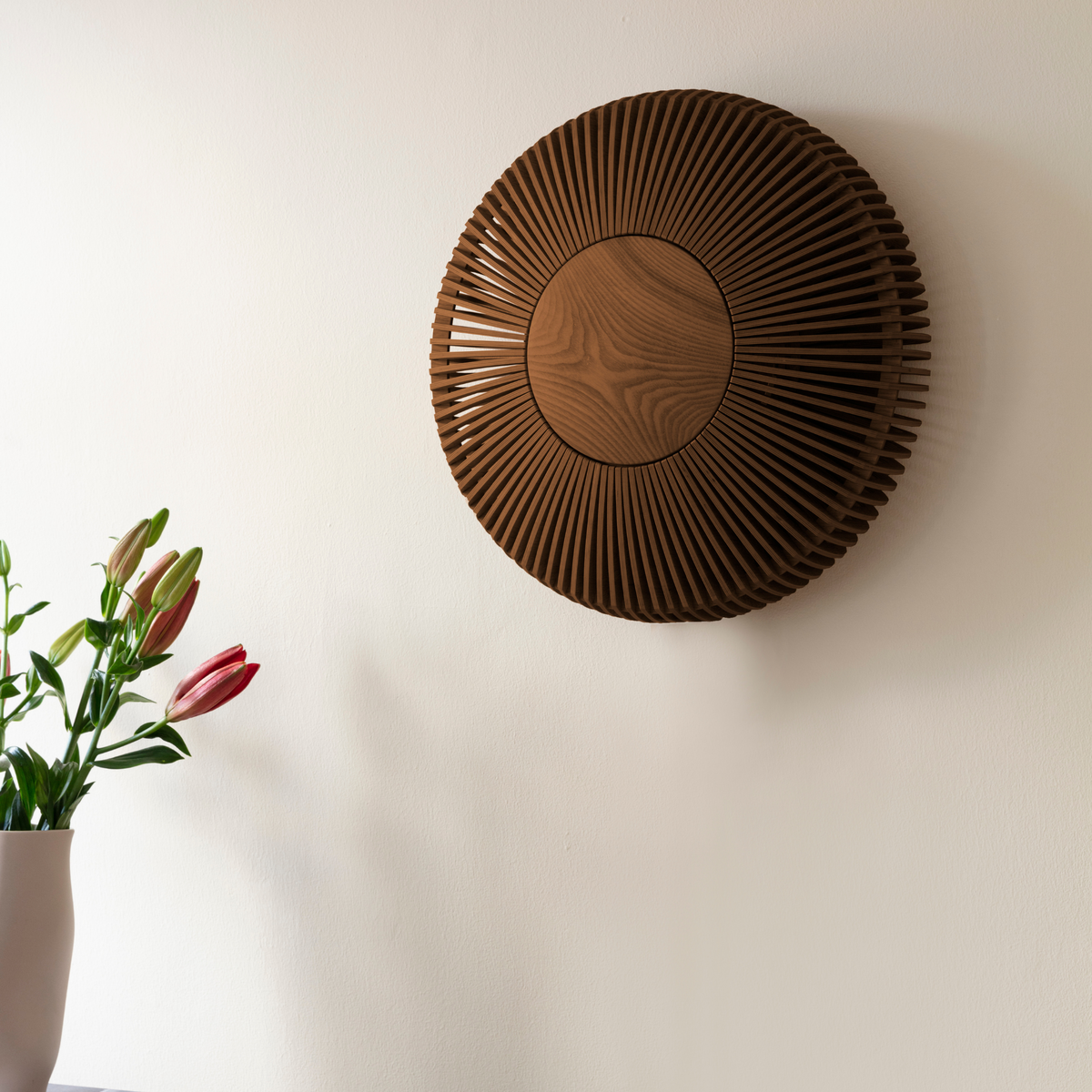 Clava Up Wood er en vegglampe laget av laserskåret trelameller, designet for å belyse hjemmet med lekne lysstråler på veggene i det omkringliggende rommet.