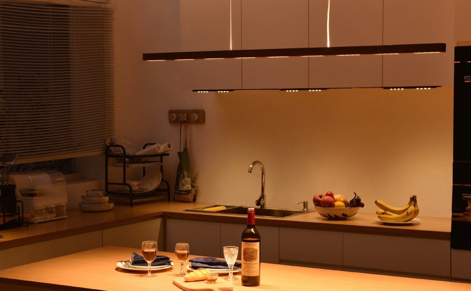 600 med lys ned, og tilnærmet blendfritt lys. Lysmengden reguleres individuelt med håndbevegelse (sensor) for å skape riktig stemning rundt bordet, eks. kjøkkenøy.
